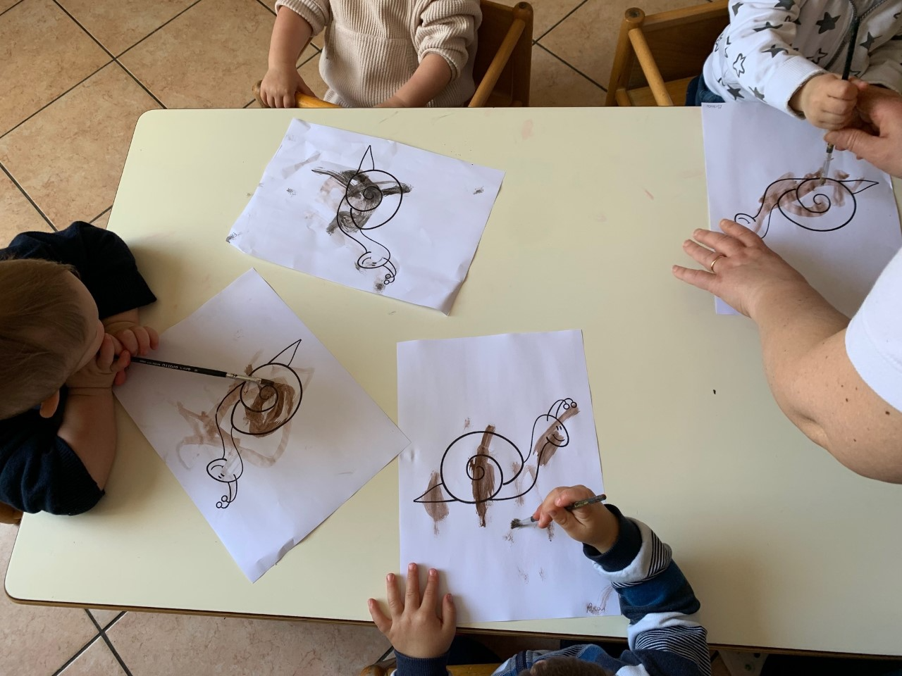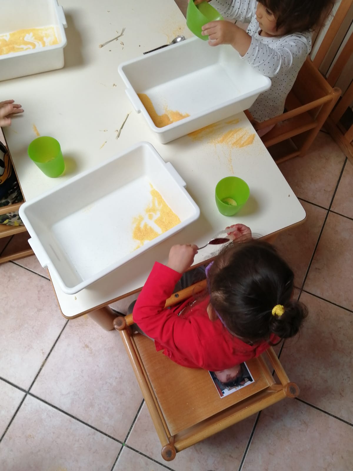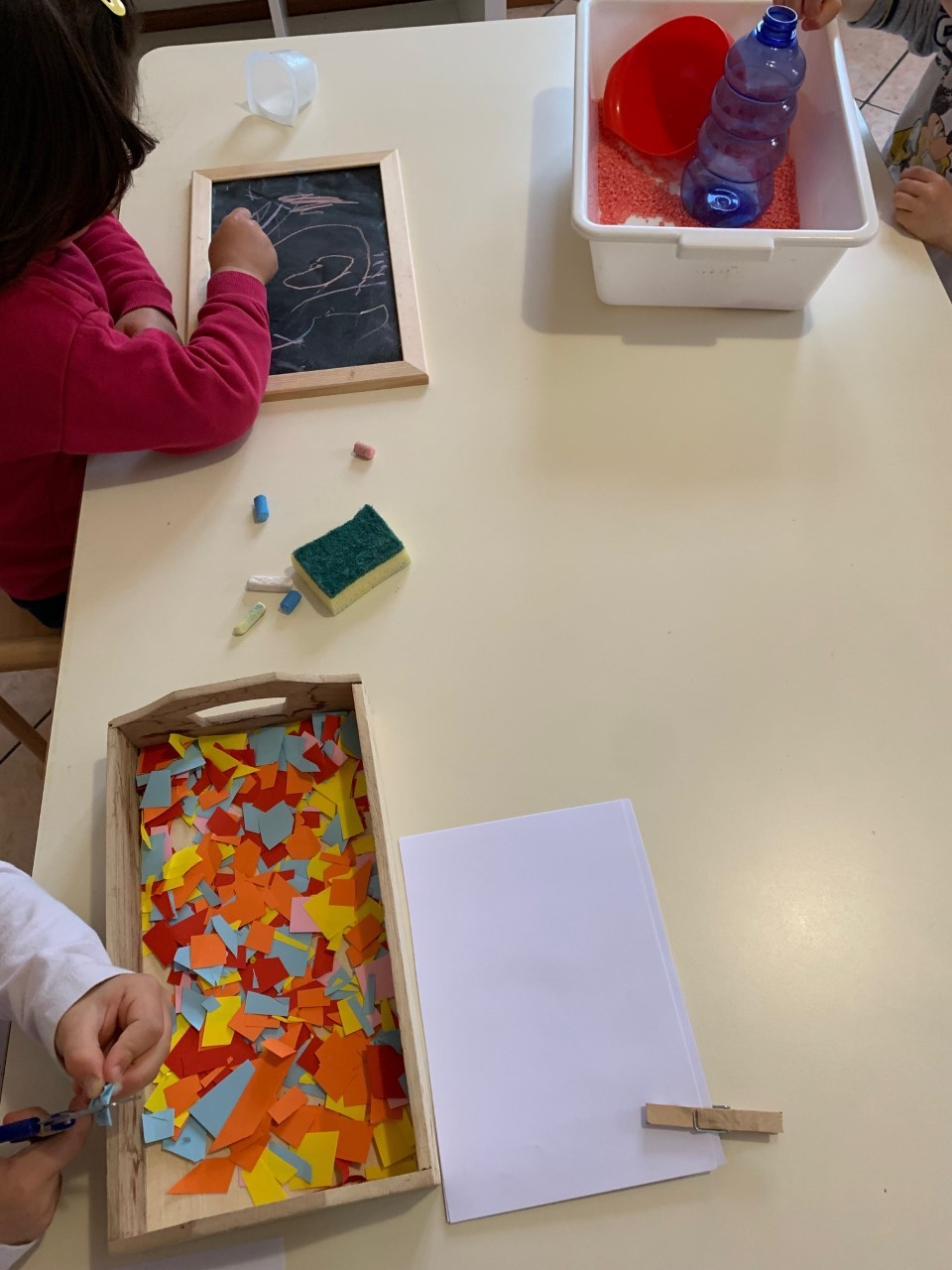 Gruppo grandi- giochi a scelta libera nei vari angoli. Es: tagliare con le forbici, travasi con sale grosso, disegno a parete con tempere, lavagnetta con i gessi.