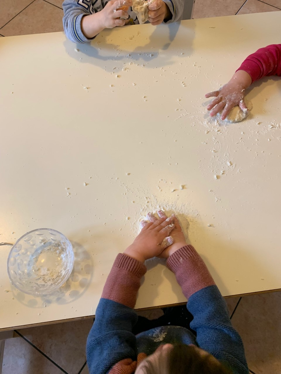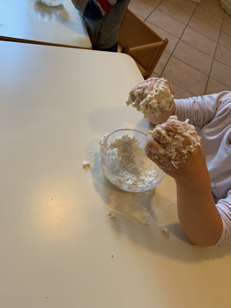 Tutto il gruppo- Sgraniamo le spighe di grano e osserviamo i chicchi che escono. Poi giochiamo con la farina bianca e impastiamo.