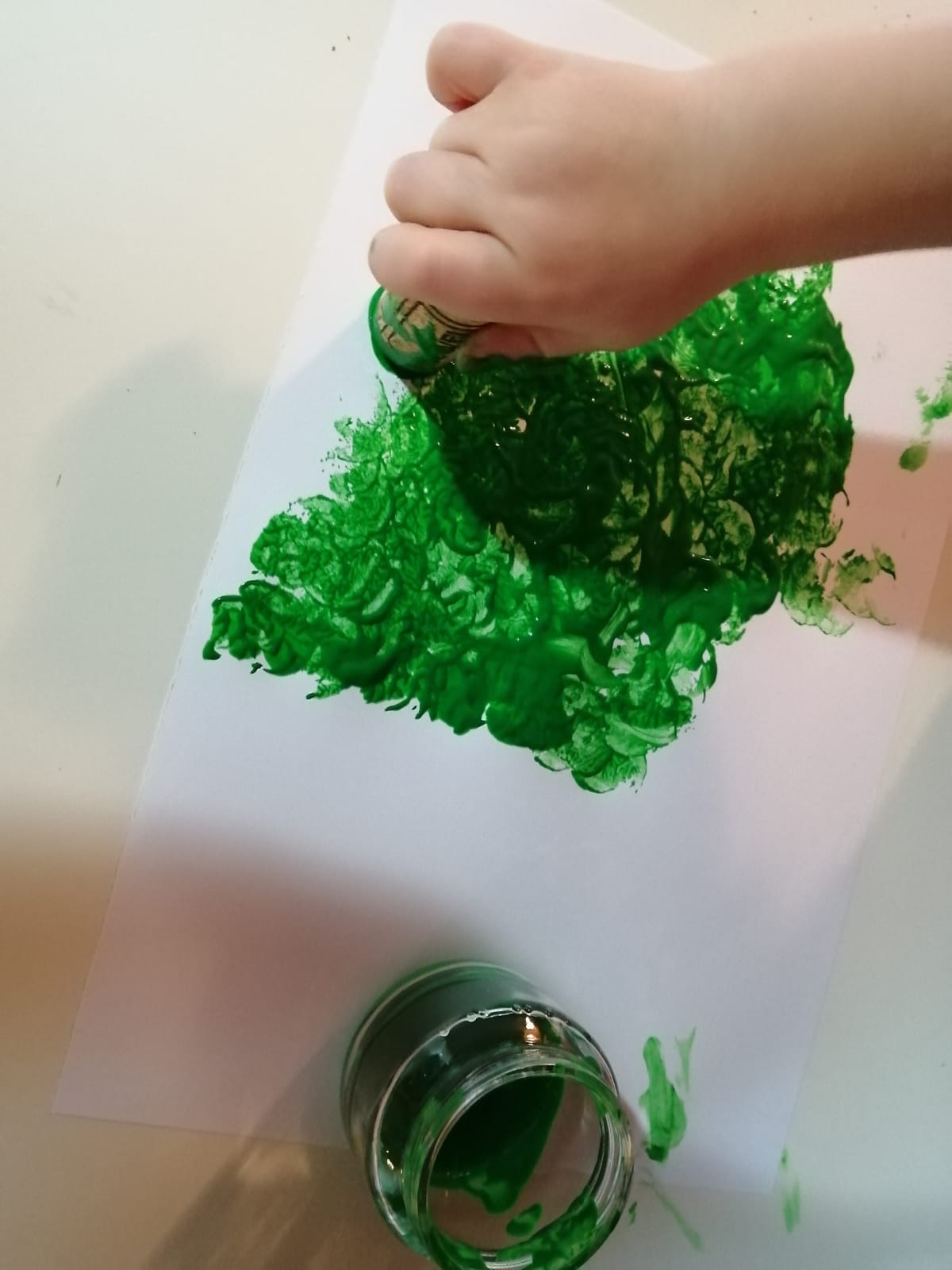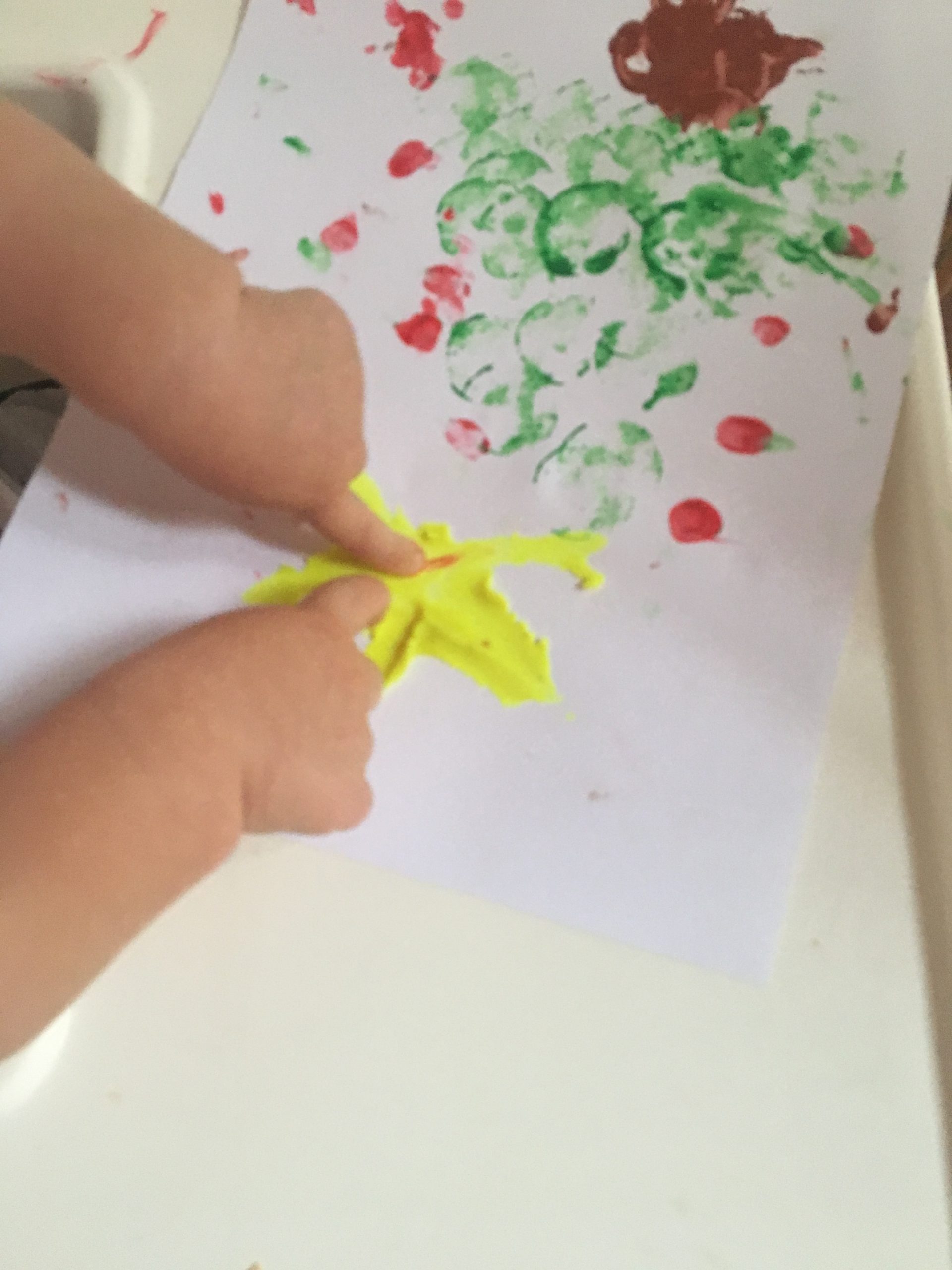 attività espressiva – alberello di Natale : timbrini con tappi di sughero, palline con tempera a dita, stellina con strisce di pongo.