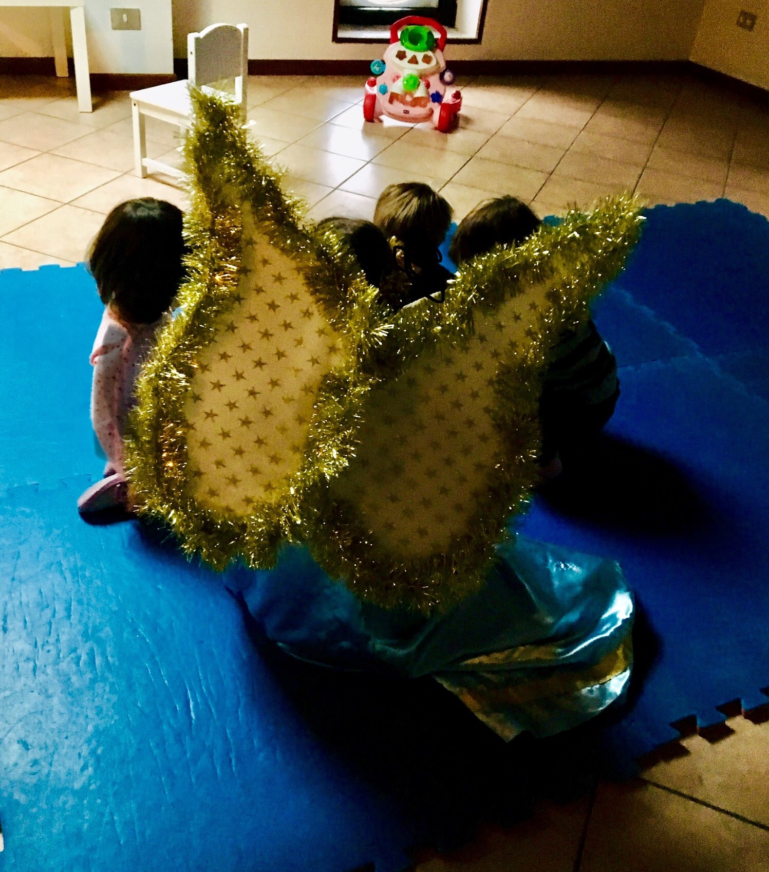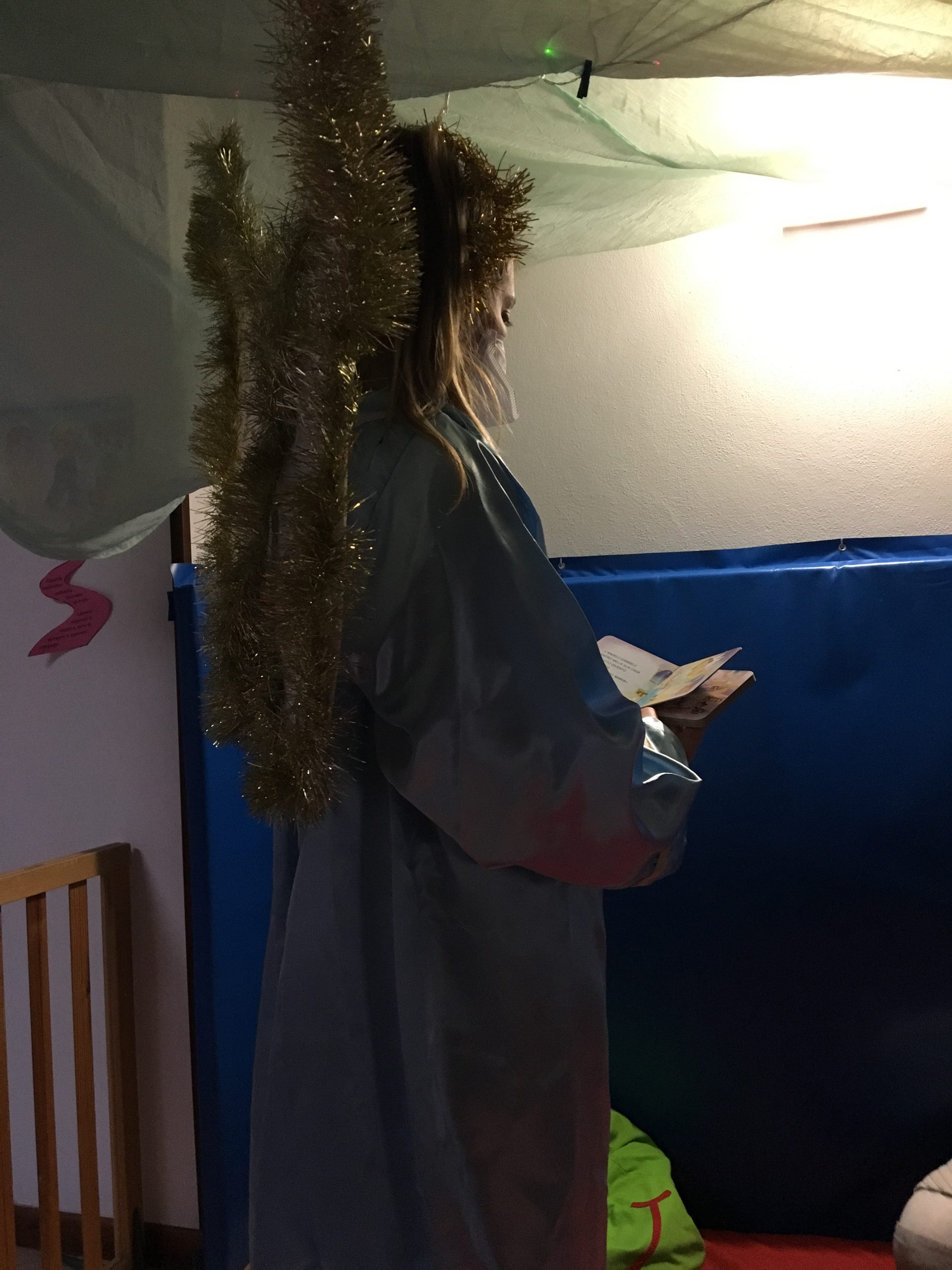 Attività teatrale: due angeli raccontano la storia della nascita di Gesù, poi ci travestiamo da angioletti con tunica, ali e coroncina dorata.