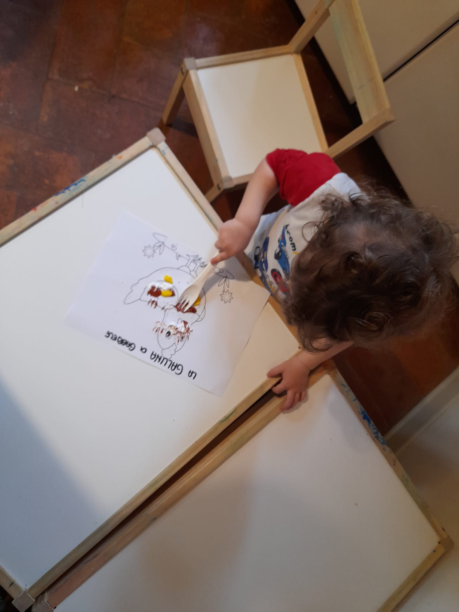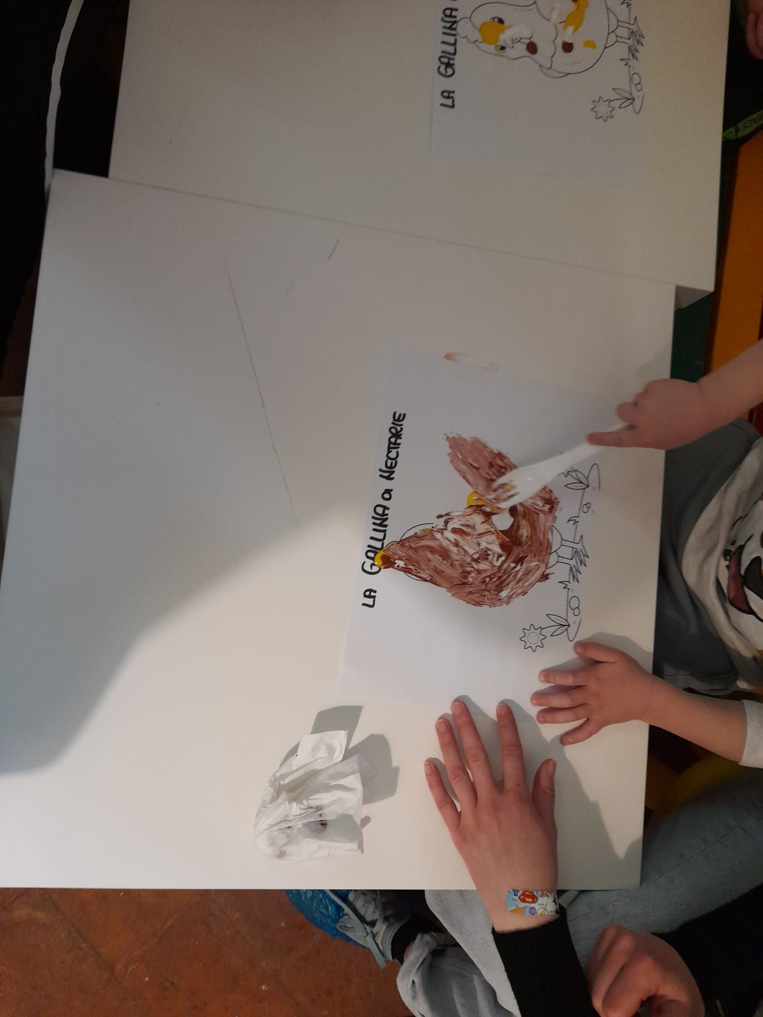 la GALLINA: con l’uso delle forchette abbiamo colorato con la tempera la gallina