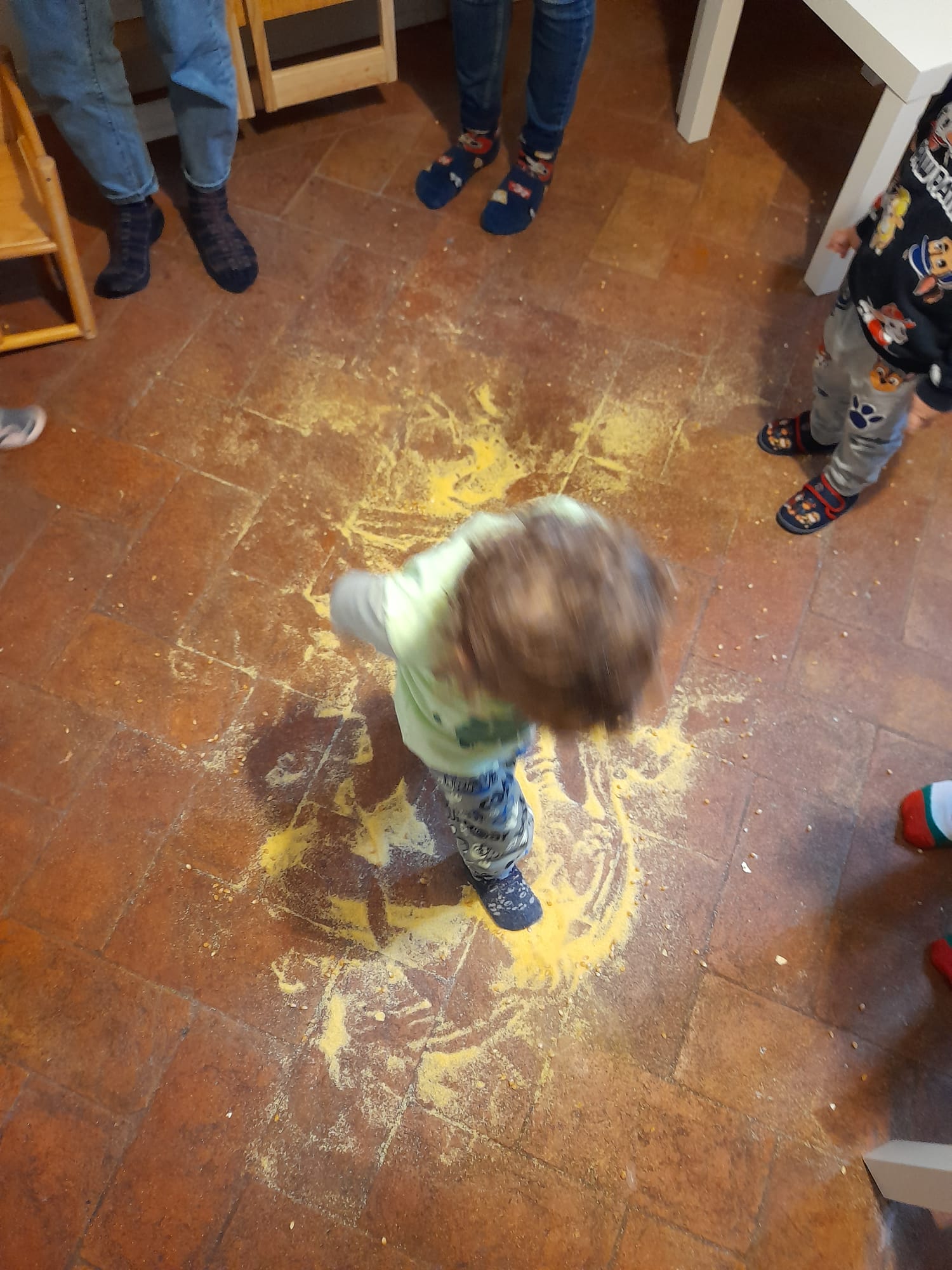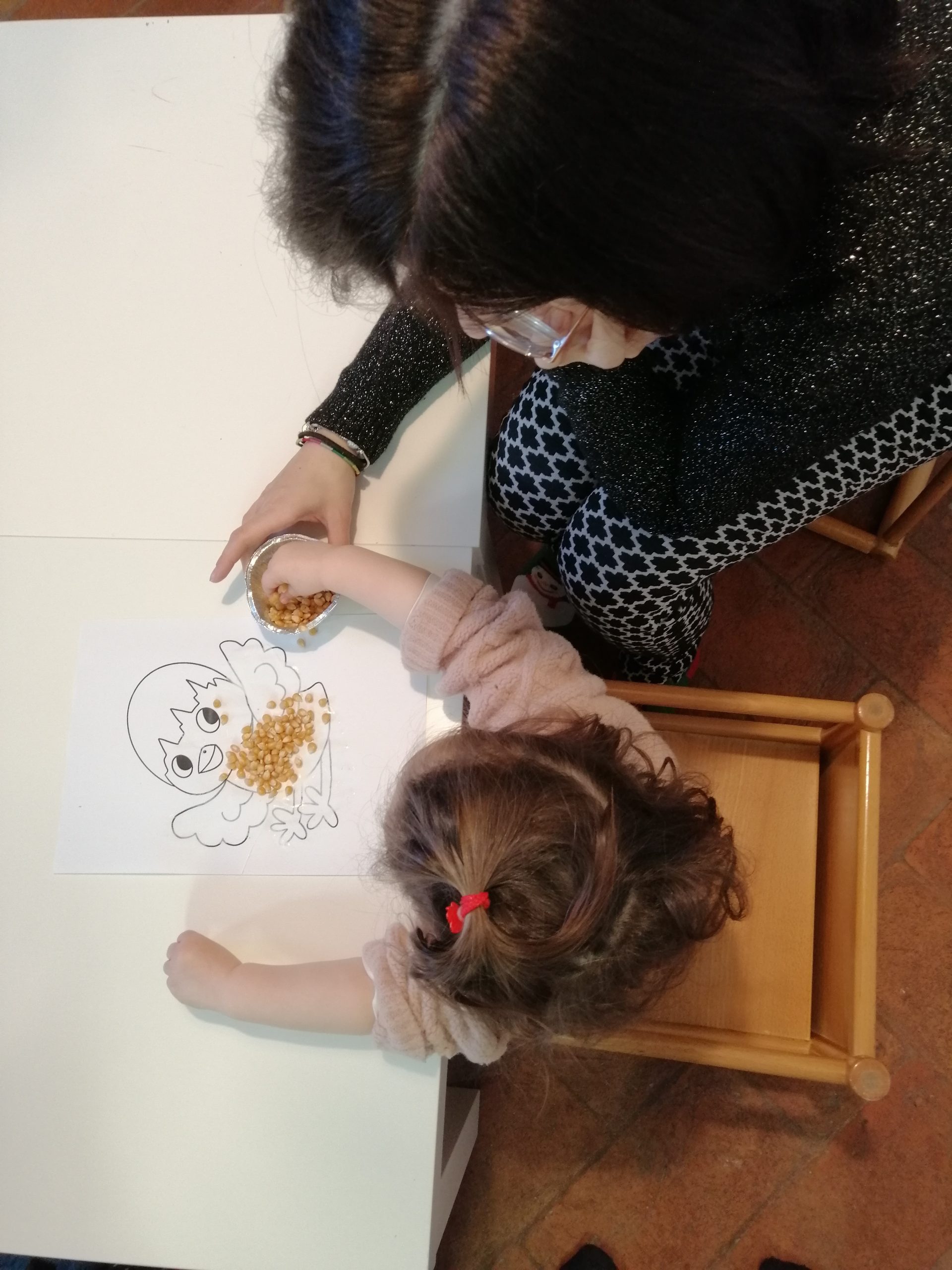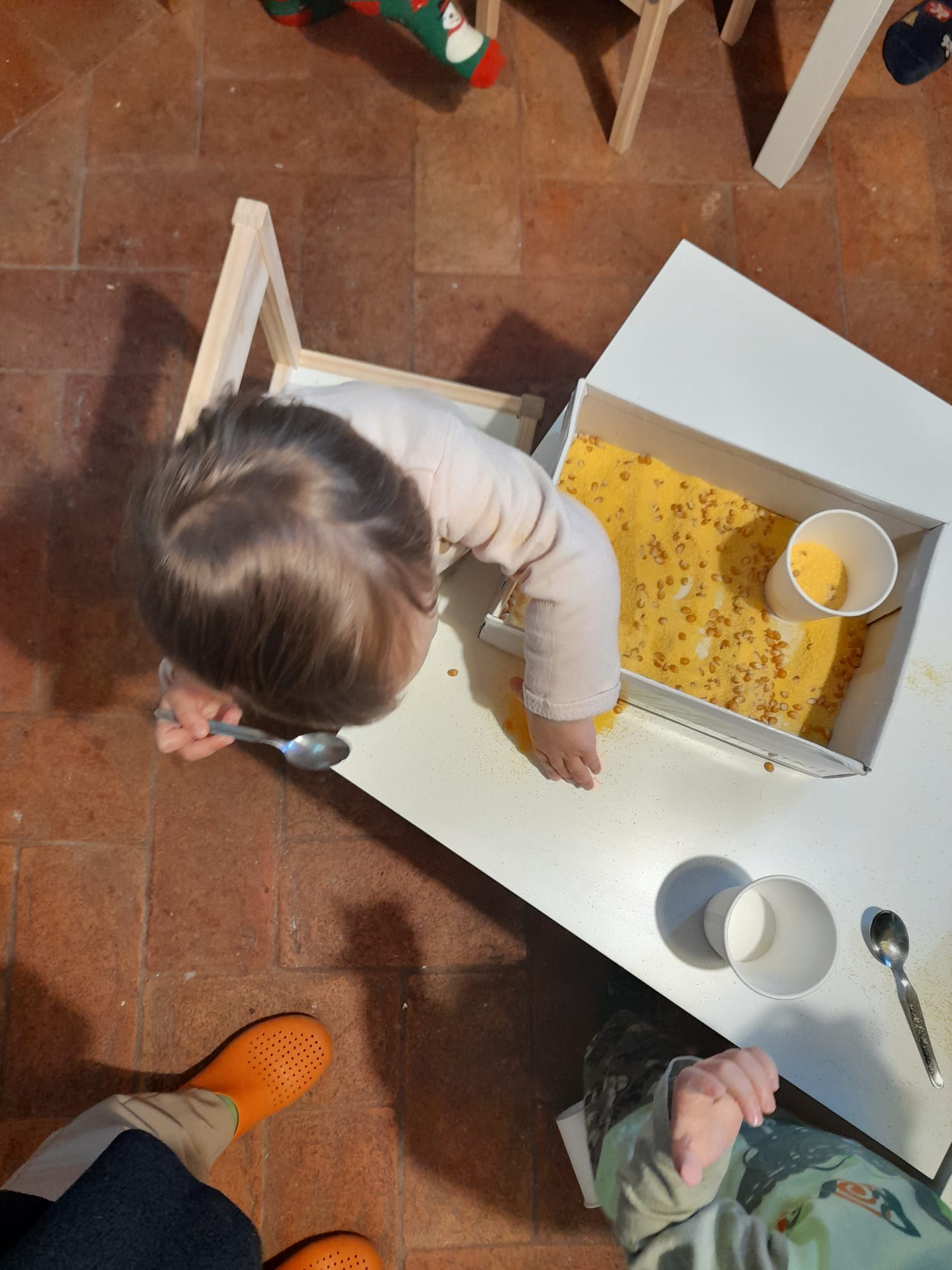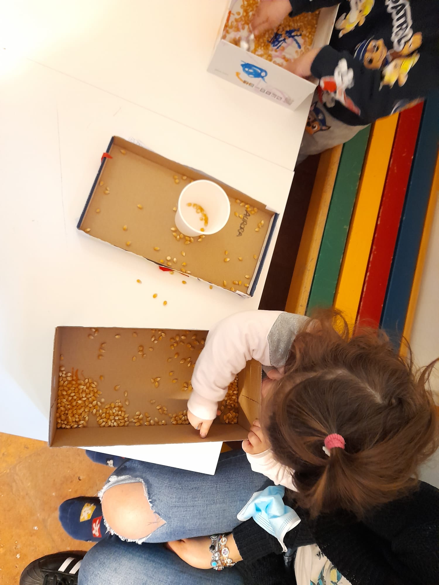 per la gallina abbiamo fatto i travasi con il mais e la farina gialla: che bello!!!