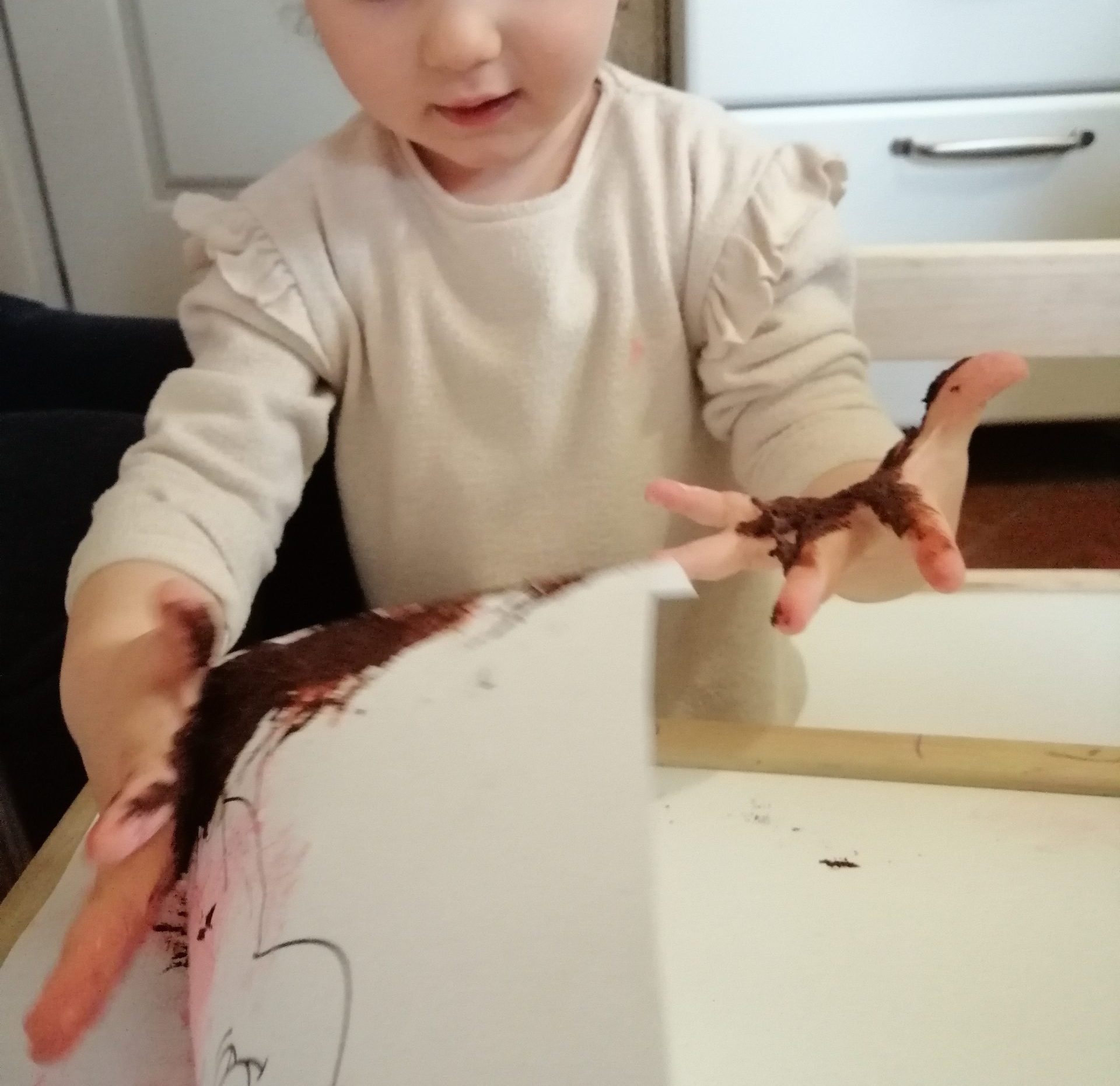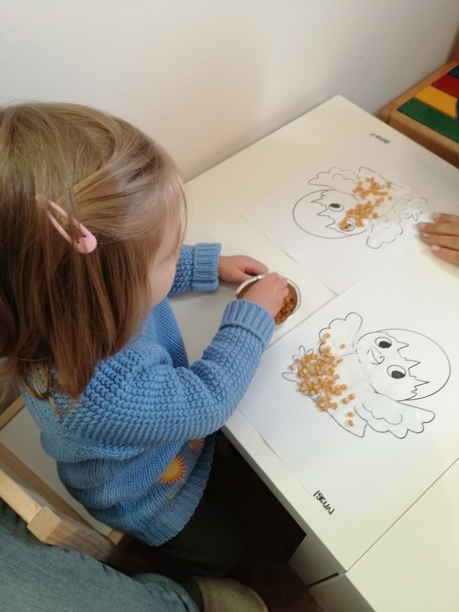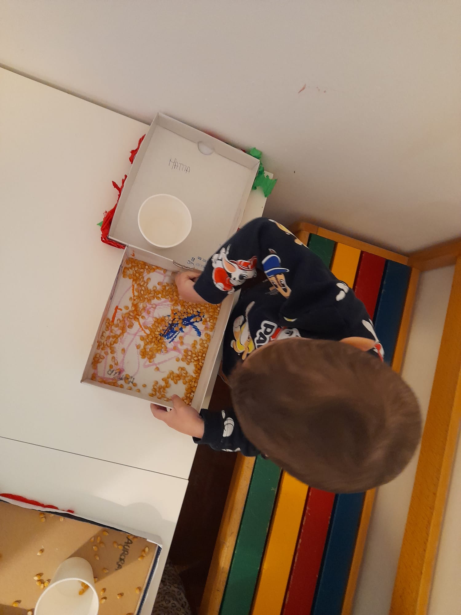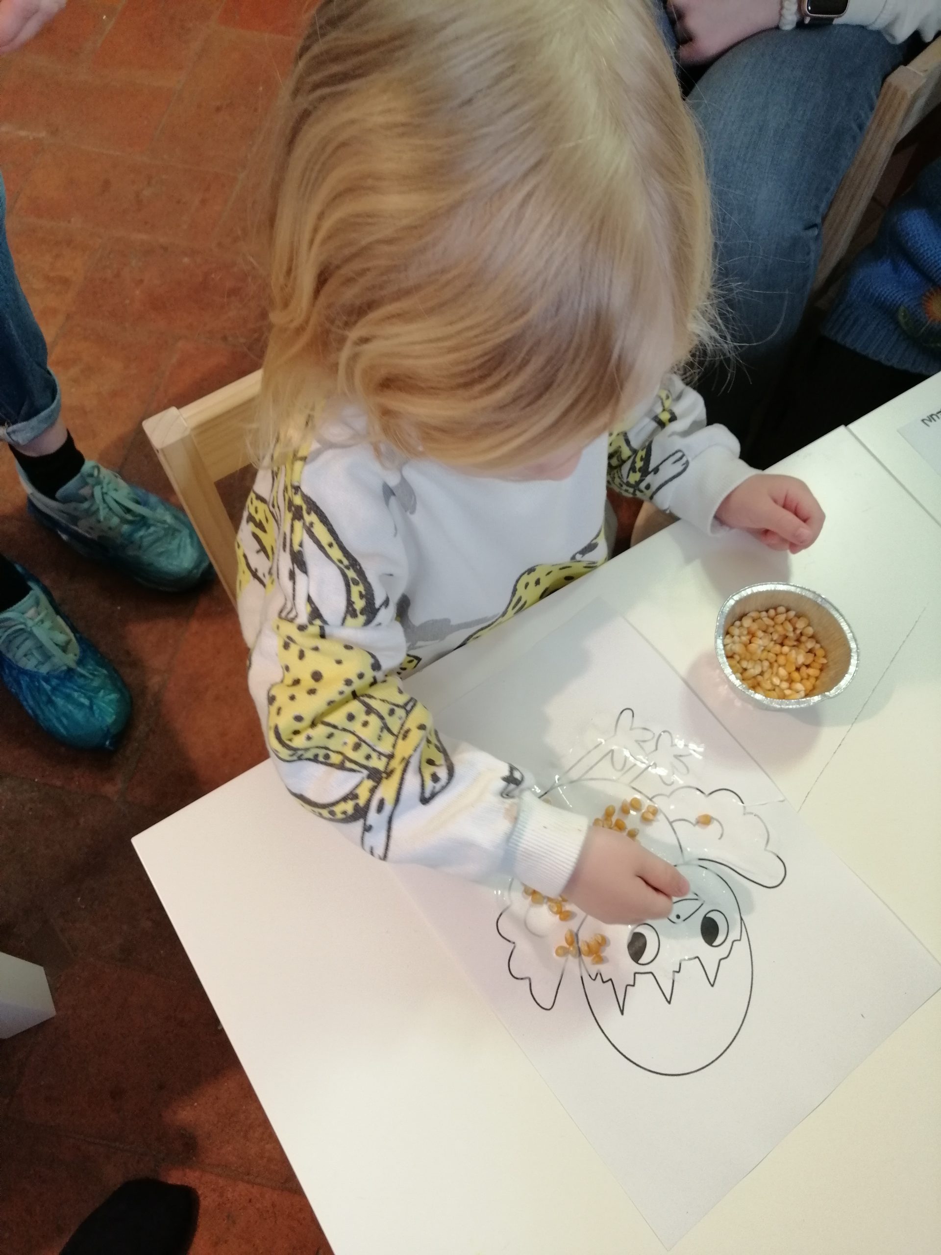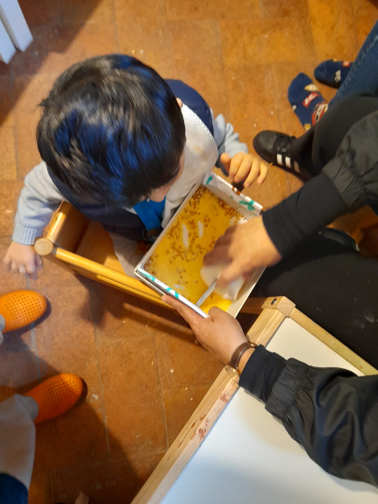 per la gallina abbiamo fatto i travasi con il mais e la farina gialla: che bello!!!