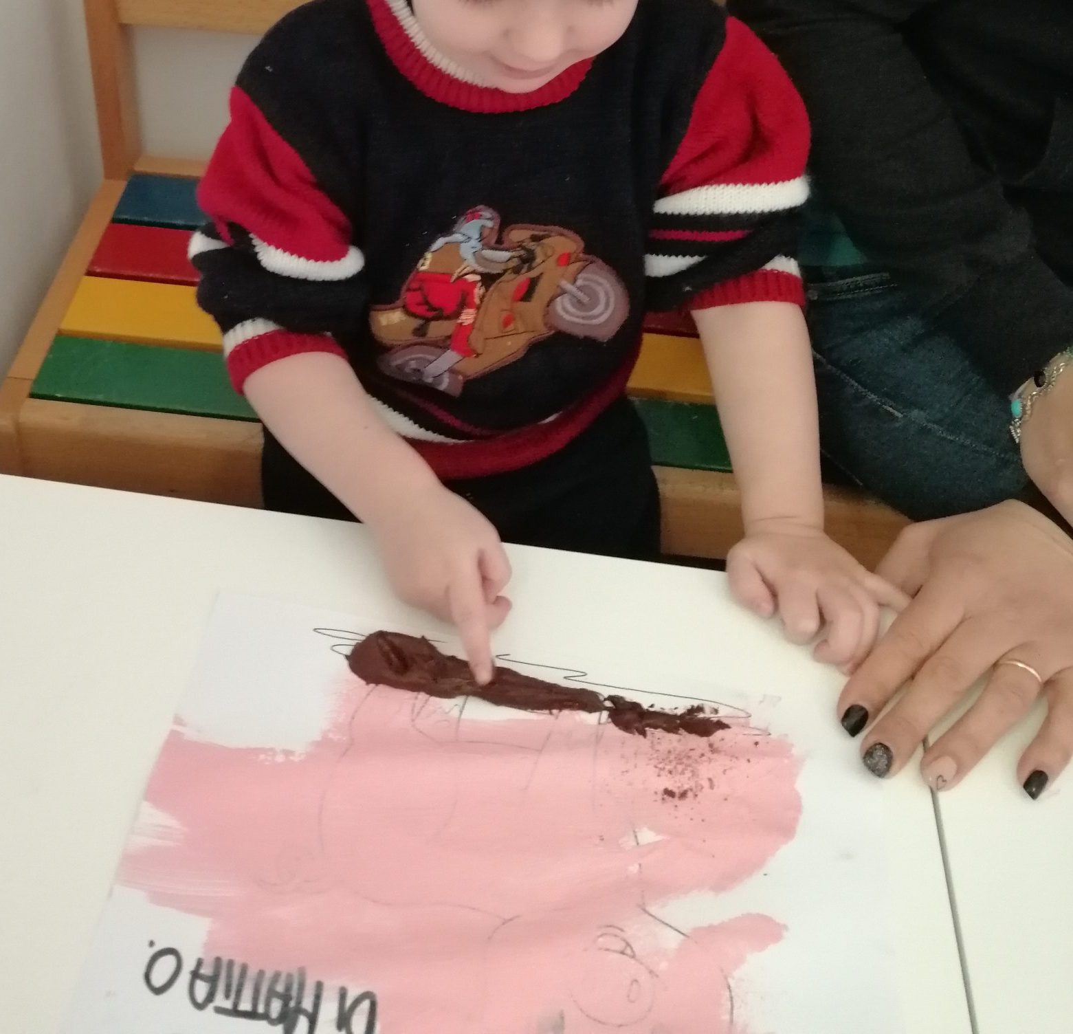Il MAIALINO: abbiamo mangiato panino e prosciutto e poi abbiamo colorato con la tempera rosa e la spugna la sua figura e per fare il fango abbiamo usato il cacao. Che spasso!