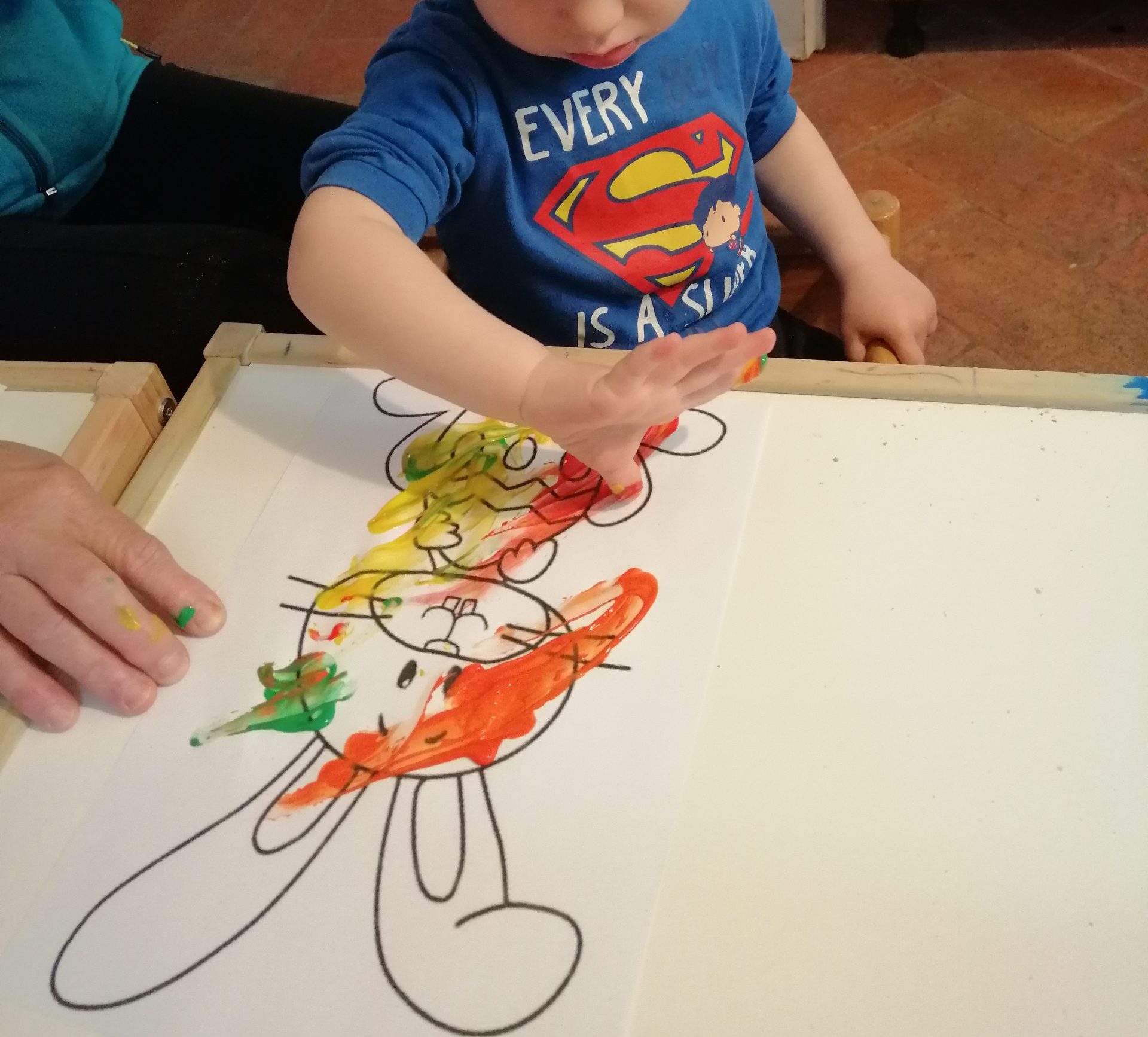 con le nostre dita e la tempera abbiamo decorato il coniglietto pasquale