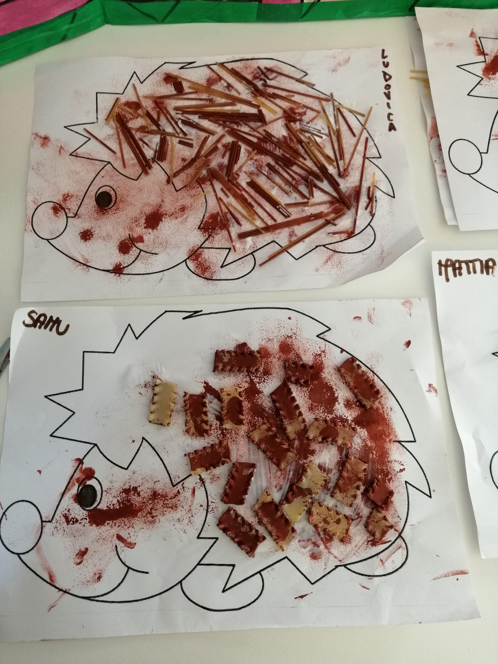 Dopo le prime attività di benvenuto e conoscenza del gruppo, abbiamo iniziato le attività con il tema dell’autunno, siamo andati a raccogliere le foglie in giardino, abbiamo fatto con queste dei bellissimi lavoretti. Dopodiché abbiamo conosciuto il sig. Riccio, lo abbiamo realizzato utilizzando tempere e pasta per far vivere ai bambini diverse esperienze sensoriali.