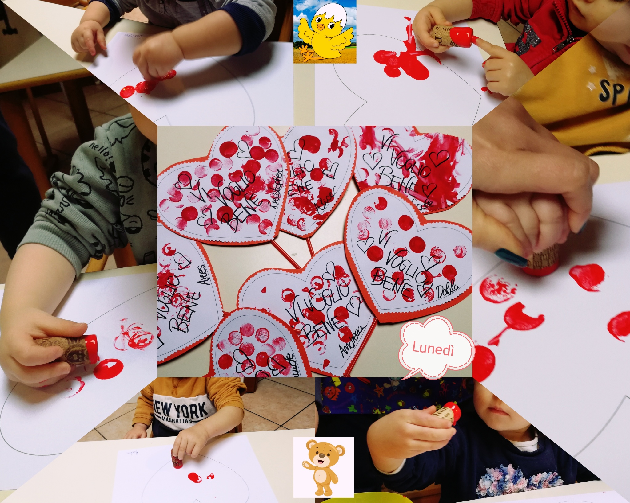 Gruppo orsetti e pulcini attività espressiva: i bambini utilizzando i tappi di sughero e la tempera rossa decorano il grande cuore per la loro famiglia: Vi Voglio Bene!