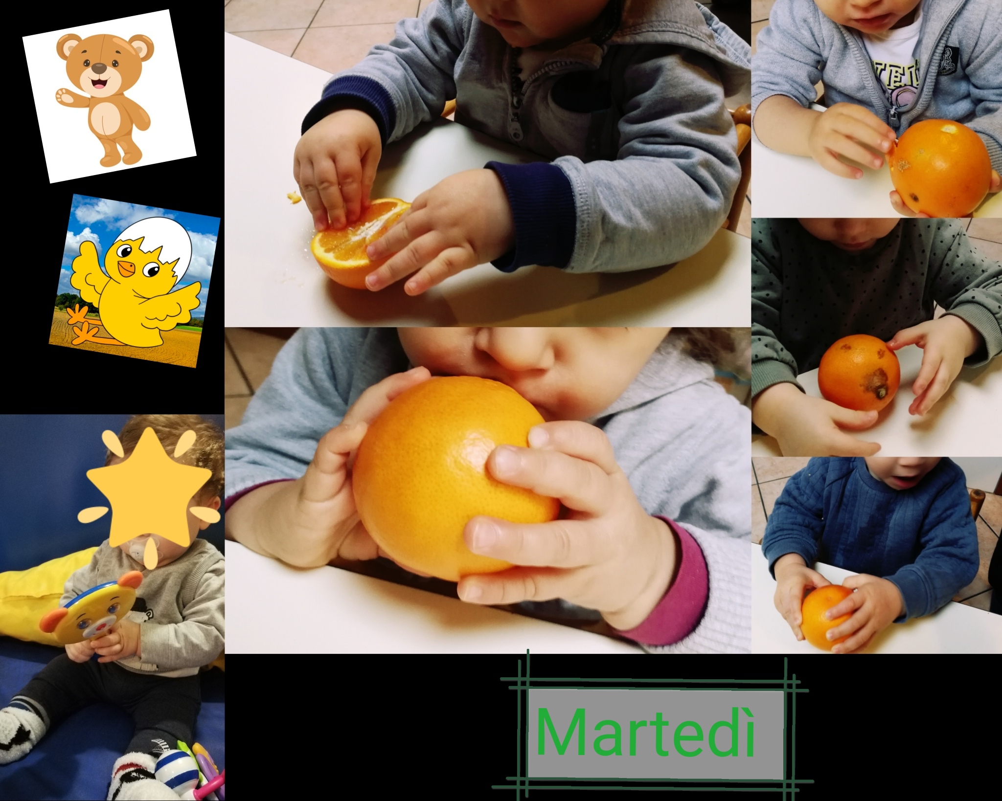 Gruppo orsetti e pulcini attività sensoriale: oggi i bambini scoprono il frutto L’ARANCIA, ne osserviamo il colore e la forma, e poi scopriamo il suo interno. Che profumo!!