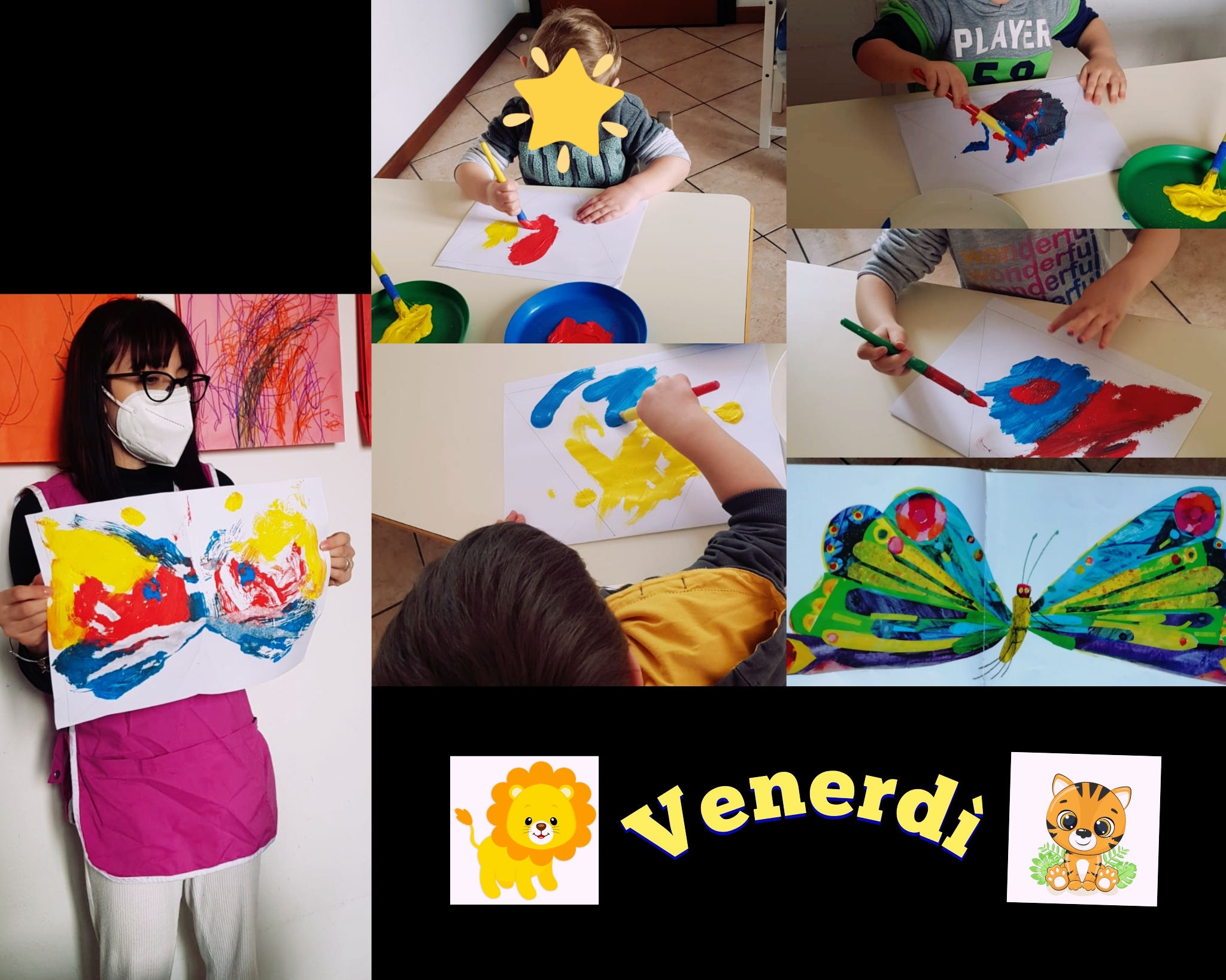 Gruppo leoncini e tigrotti attività espressiva: scopriamo che il bruco diventa una bellissima farfalla, realizziamo questa con le tempere pitturiamo sul foglio lo chiudiamo e aprendo il foglio si trasforma in una farfalla. Che meraviglia!