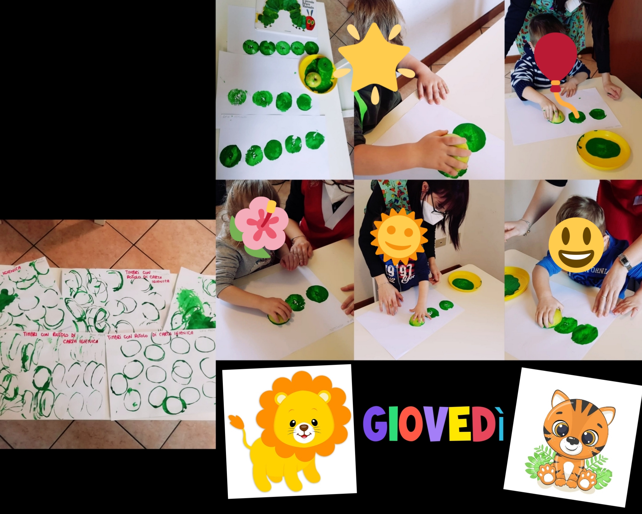 Gruppo leoncini e tigrotti attività di lettura ed espressiva: oggi prepariamo il bruco, dopo aver letto la storia “il piccolo bruco mai sazio“. Lo disegniamo con la tempera verde utilizzando la mela per fare i timbri del corpo del bruco e poi facciamo dei timbri con il rotolo della carta igienica.