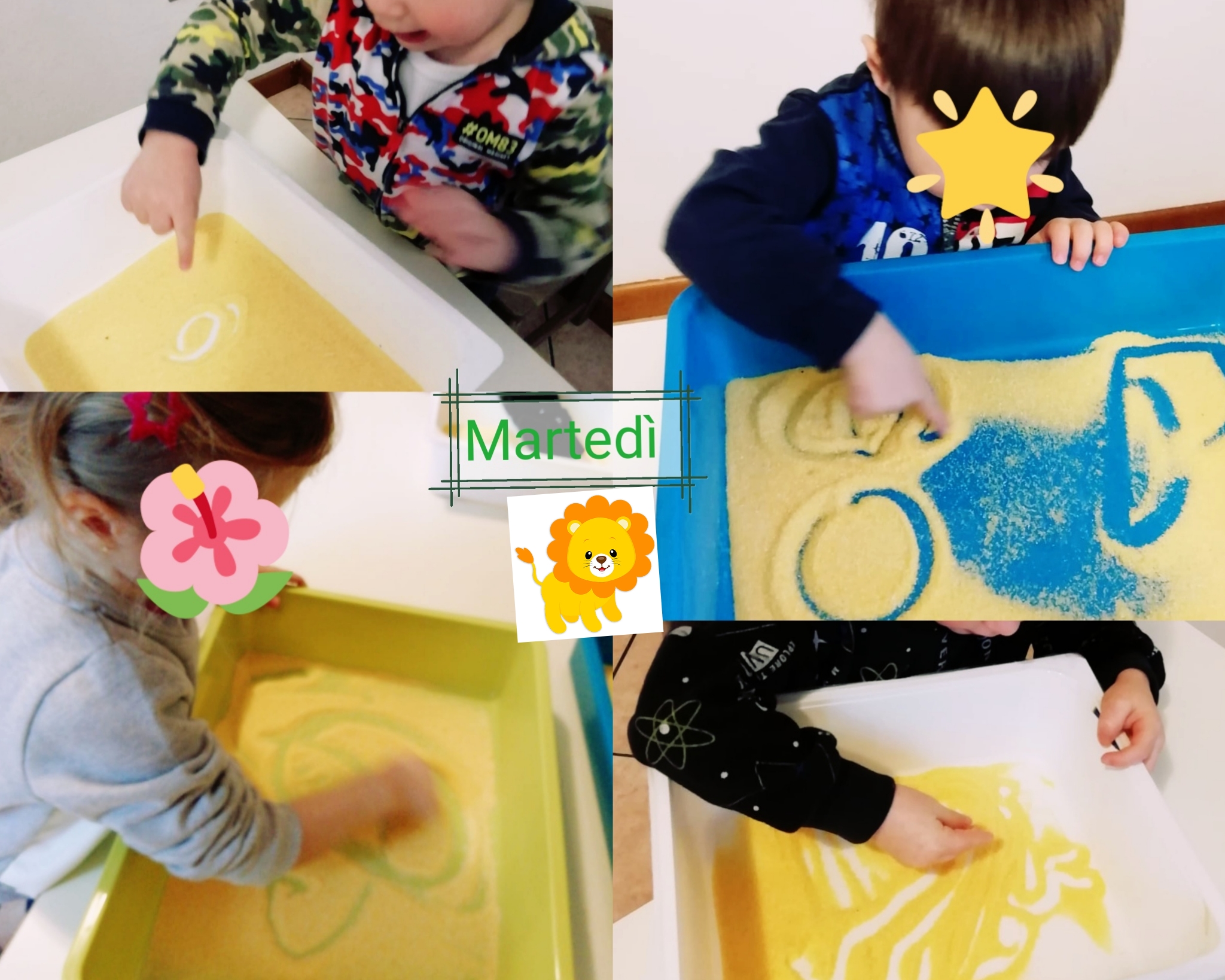 Gruppo leoncini e tigrotti attività sensoriale: oggi i bambini si sperimentano nel disegno sensoriale, ciascun bambino ha una vaschetta contenente della farina gialla e utilizzando loro dita si divertono a disegnare liberamente. Poi le maestre ci danno delle immagini e proviamo a riprodurle.