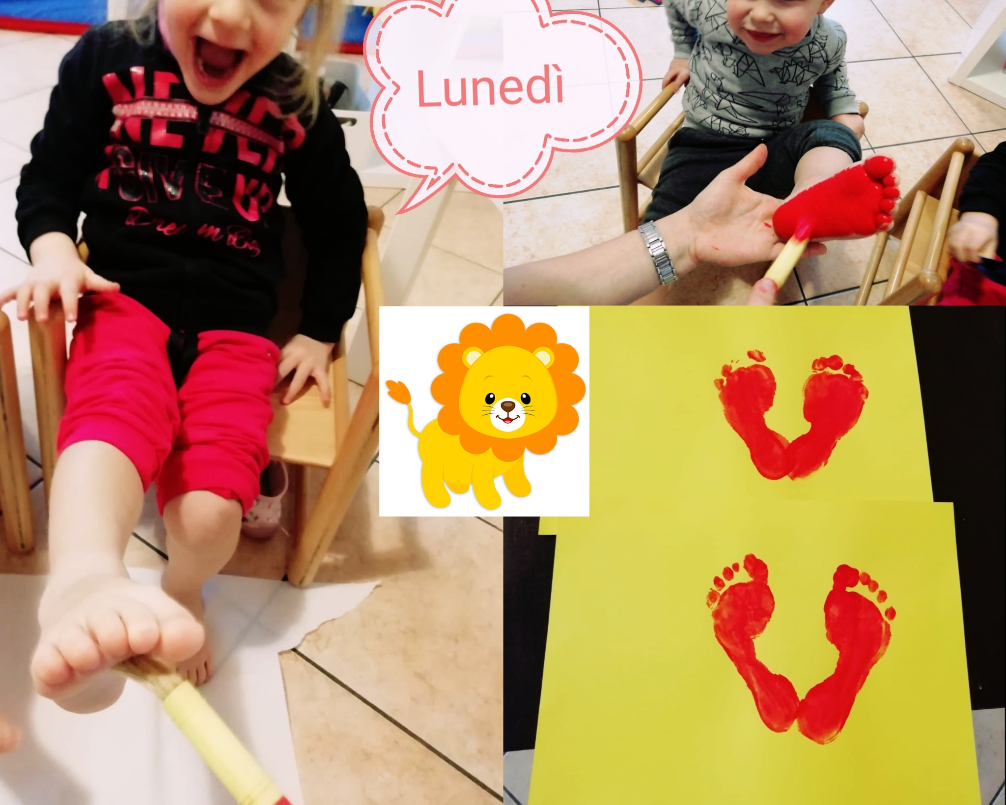 Gruppo leoncini attività espressiva: disegniamo un bellissimo cuore, utilizzando la tempera rossa e i nostri piedini. Che solletico sotto il piedino!!! Lasciamo la nostra impronta sul vostro cuore.