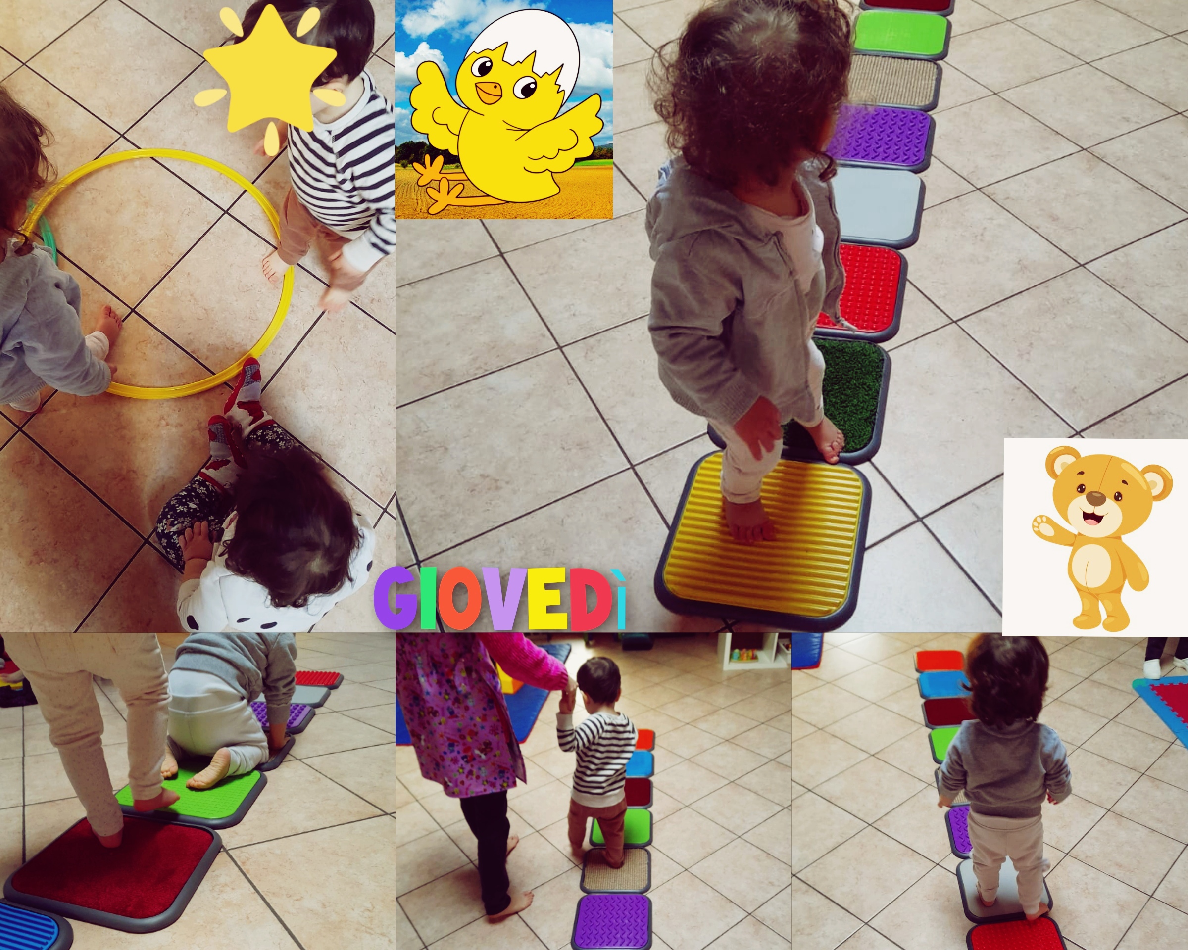 Gruppo orsetti e pulcini attività sensoriale e ginnastica: oggi i bambini scoprono i pannelli sensoriali sia con le loro manine e piedini, sperimentano i diversi materiali e le diverse sensazioni tattili. Successivamente, saltiamo dentro e fuori dal cerchio