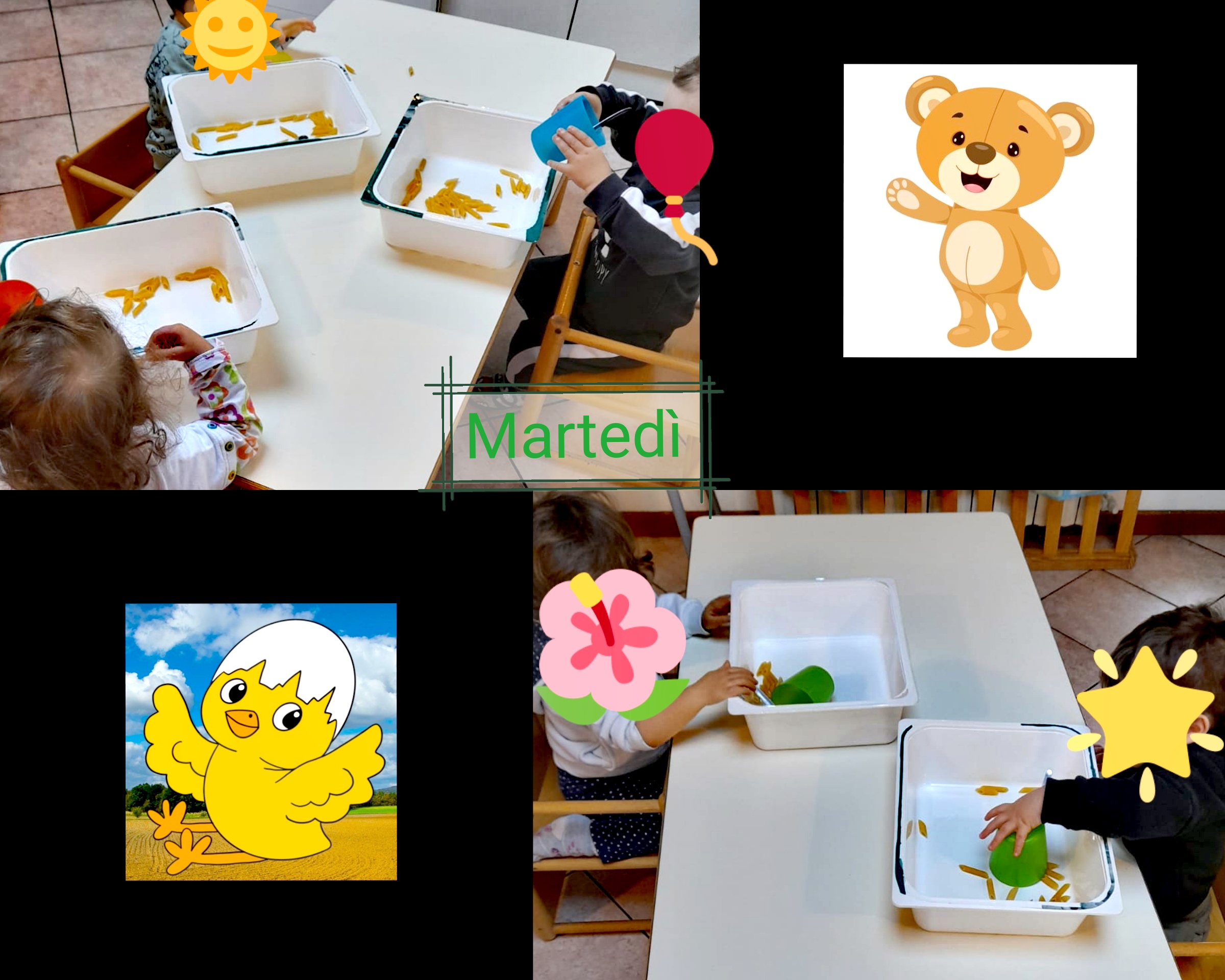 Gruppo orsetti e pulcini attività di travasi: oggi a ciascun bambino viene dato un recipiente con della pasta e un bicchiere, in cui mettere la pasta, spostarla e travasarla nuovamente nel contenitore grande. I bambini grazie a quest’attività sviluppano la loro motricità fine.