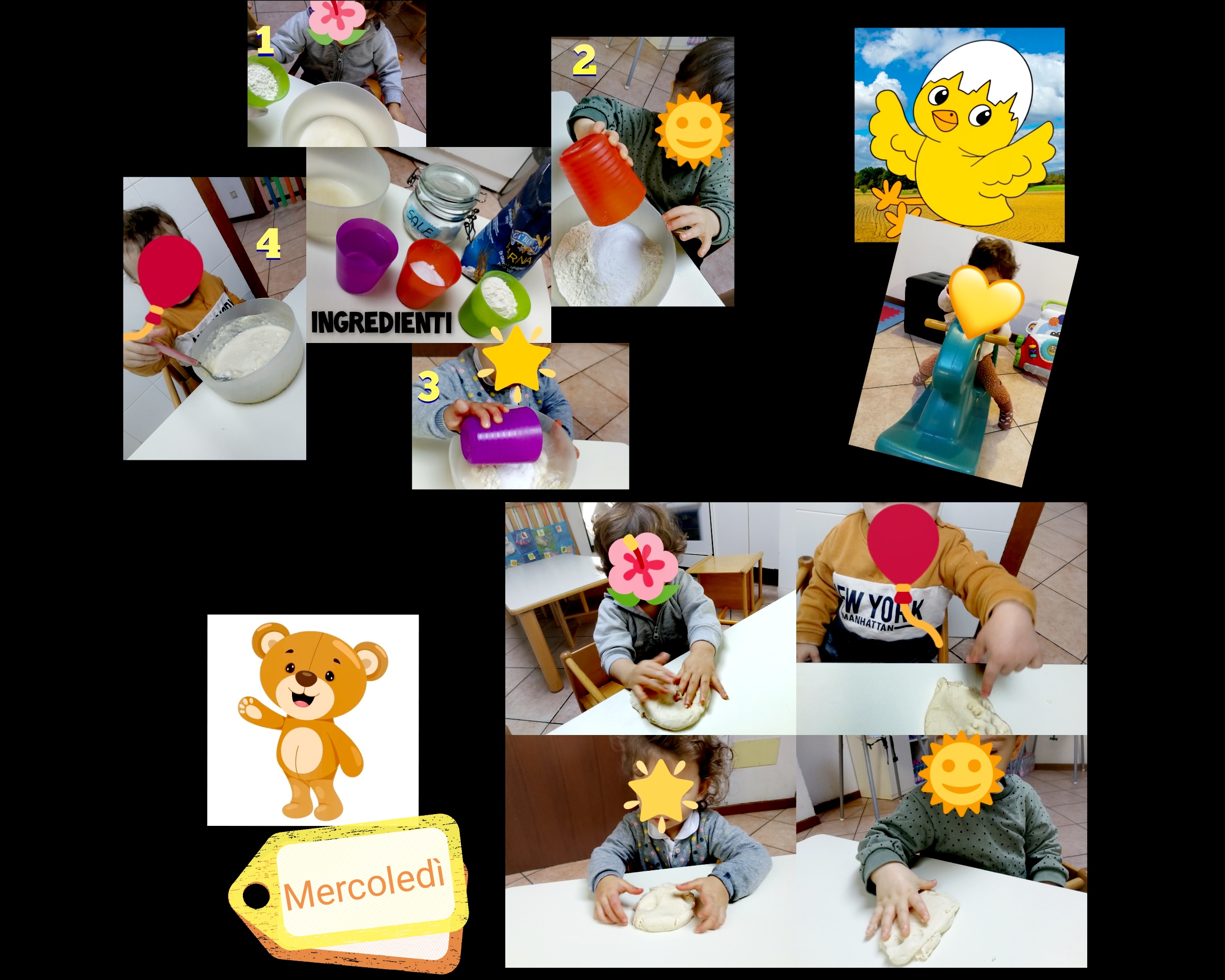 Gruppo orsetti e pulcini attività di manipolazione: oggi prepariamo insieme la pasta di sale, prendiamo la farina, a cui aggiungiamo un bicchiere di sale e d’acqua, infine mescoliamo. Dopodiché abbiamo pronta la nostra pasta di sale e ci divertiamo a dargli diverse forme.