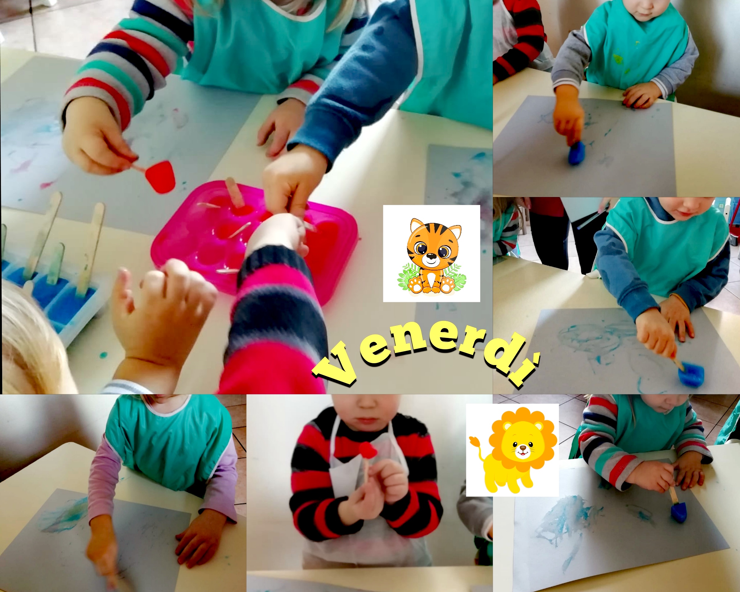 Gruppo leoncini e tigrotti attività espressiva: finalmente il nostro ghiaccio colorato è pronto, lo osserviamo meravigliati e poi lo utilizziamo per disegnare sui fogli. Che bellezza e quanto è freddo il ghiaccio!.