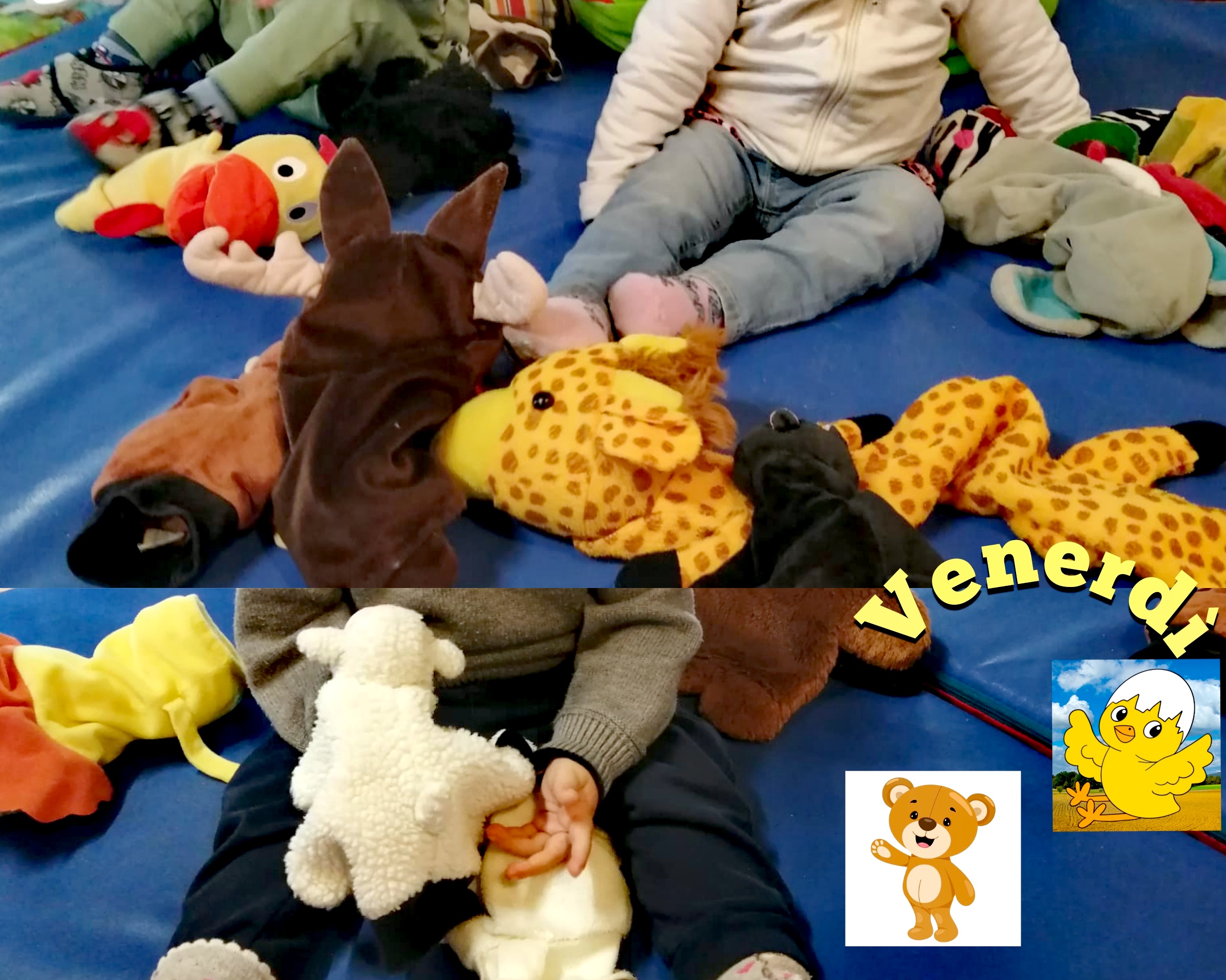 Gruppo orsetti e pulcini attività teatrale: dopo aver sentito la storia delle marionette Animali, ci divertiamo ad utilizzarle in modo libero e a riprodurre i versi dei diversi animali.