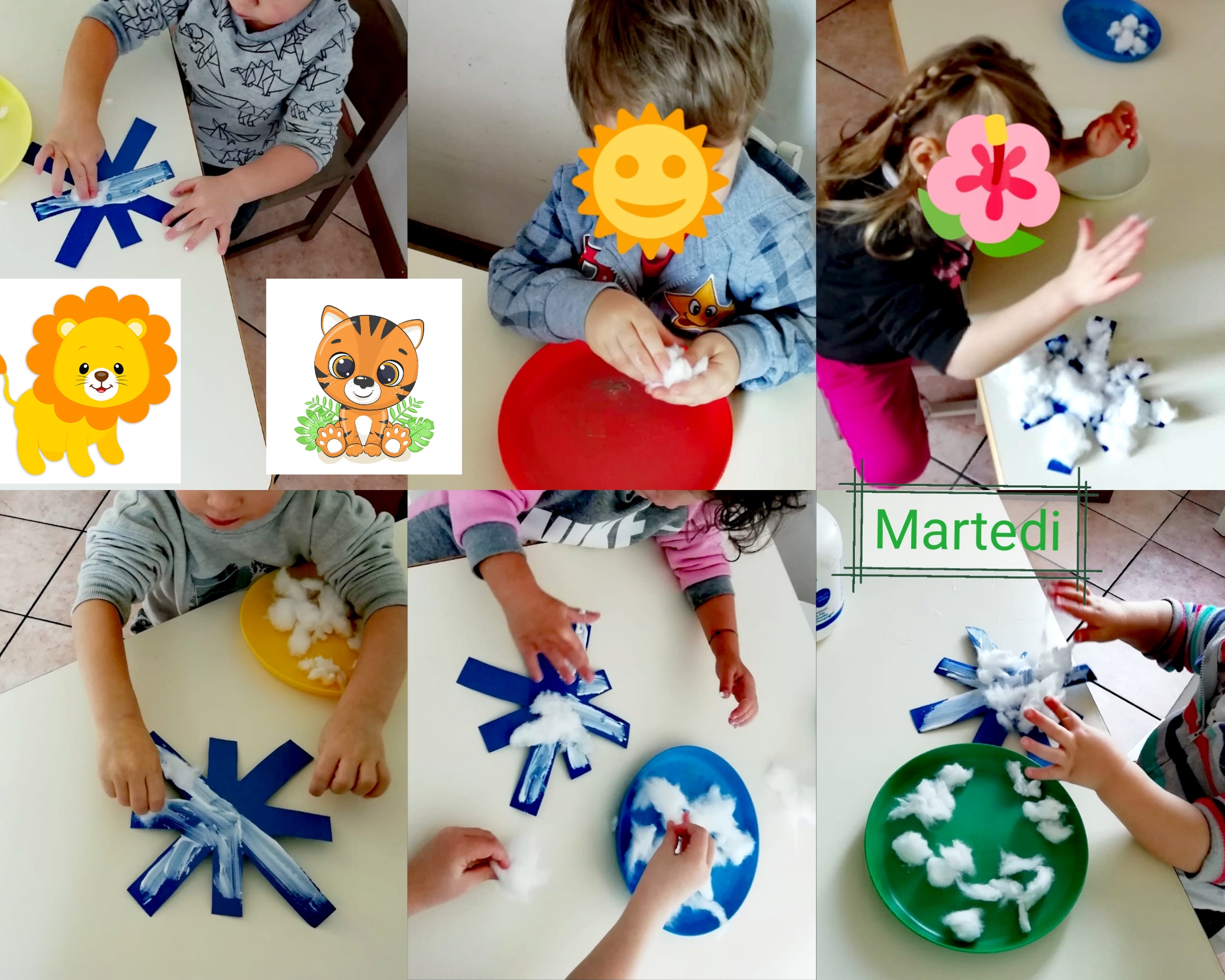 Gruppo leoncini e tigrotti attività espressiva: iniziamo la stagione dell’inverno e a conoscere uno dei suoi elementi principali il FIOCCO di NEVE, utilizziamo il cotone bianco dopo aver sentito quanto è soffice, con la vinavil incolliamo il cotone creando i nostri fiocchi di neve.