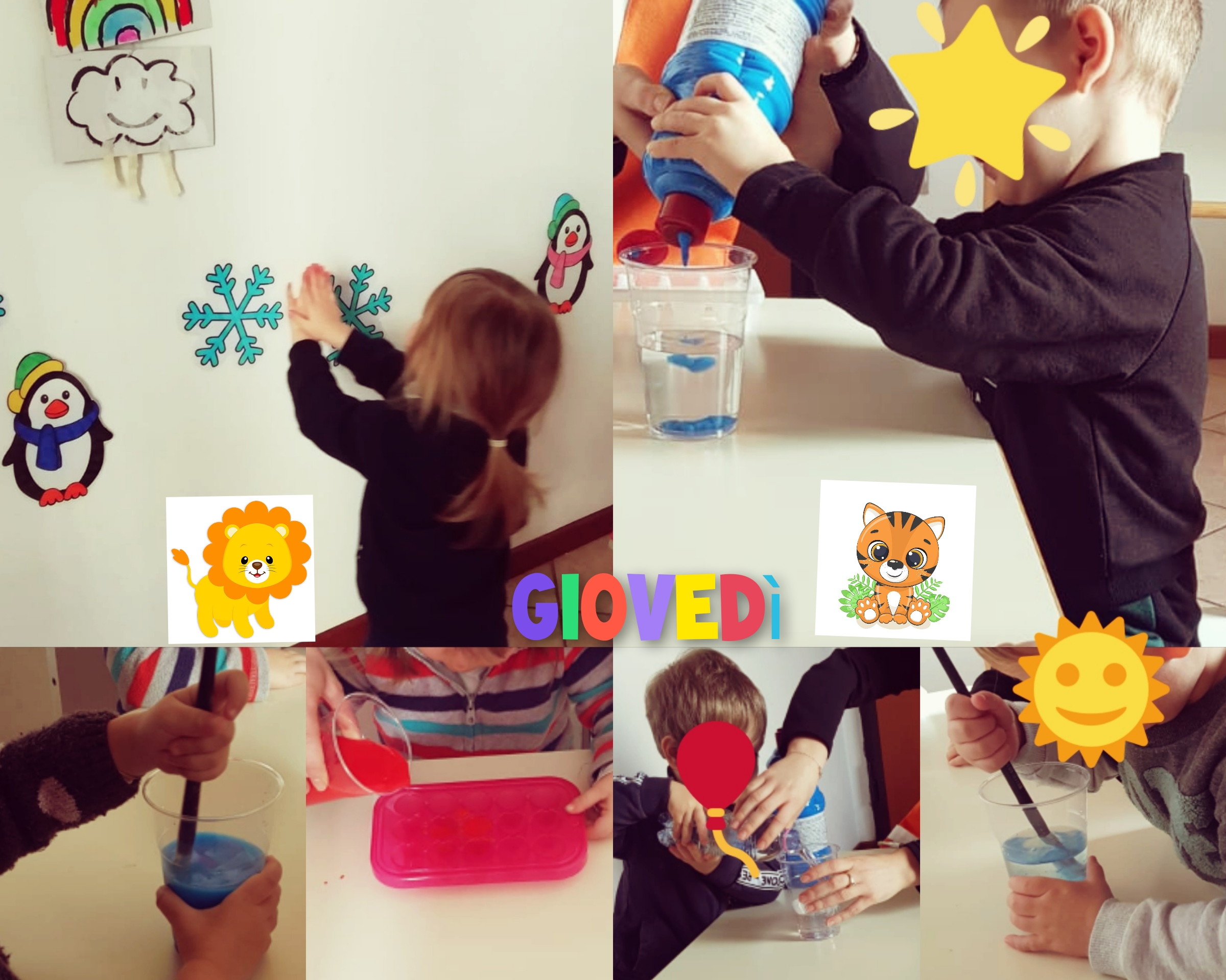 Gruppo leoncini e tigrotti attività di scoperta: oggi iniziamo a preparare i nostri cubetti di ghiaccio colorati, versiamo nell’acqua la tempera rossa e blu, poi travasiamo l’acqua nelle formine del ghiaccio che lasceremo in freezer tutta la notte e il giorno dopo scopriremo come l’acqua si trasforma da liquida a solida. Inoltre, decoriamo con gli elementi dell’inverno la nostra stanza.