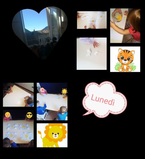 Gruppo LEONCINI e gruppo TIGROTTI → Attività espressiva, questa mattina tutti insieme osserviamo il cielo dalla finestra, descriviamo cosa vediamo, soffermandoci sui colori del cielo e dei suoi elementi: il sole e le nuvole. Dopodiché con diverse materiali (farina gialla, cannucce e cotone) rappresentiamo il cielo con il sole e le nuvole. Durante quest’attività i bambini non solo imparano ad osservare l’ambiente esterno, ma fanno esperienza di diversi materiali sperimentando diverse sensazioni tattili (morbido, ruvido, liscio).