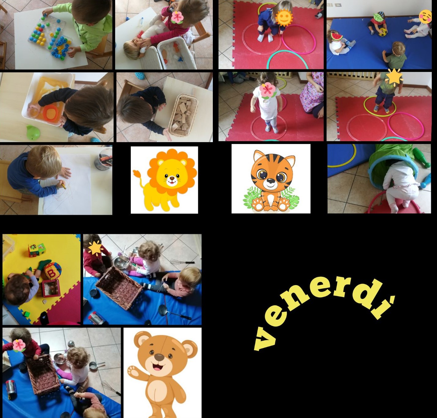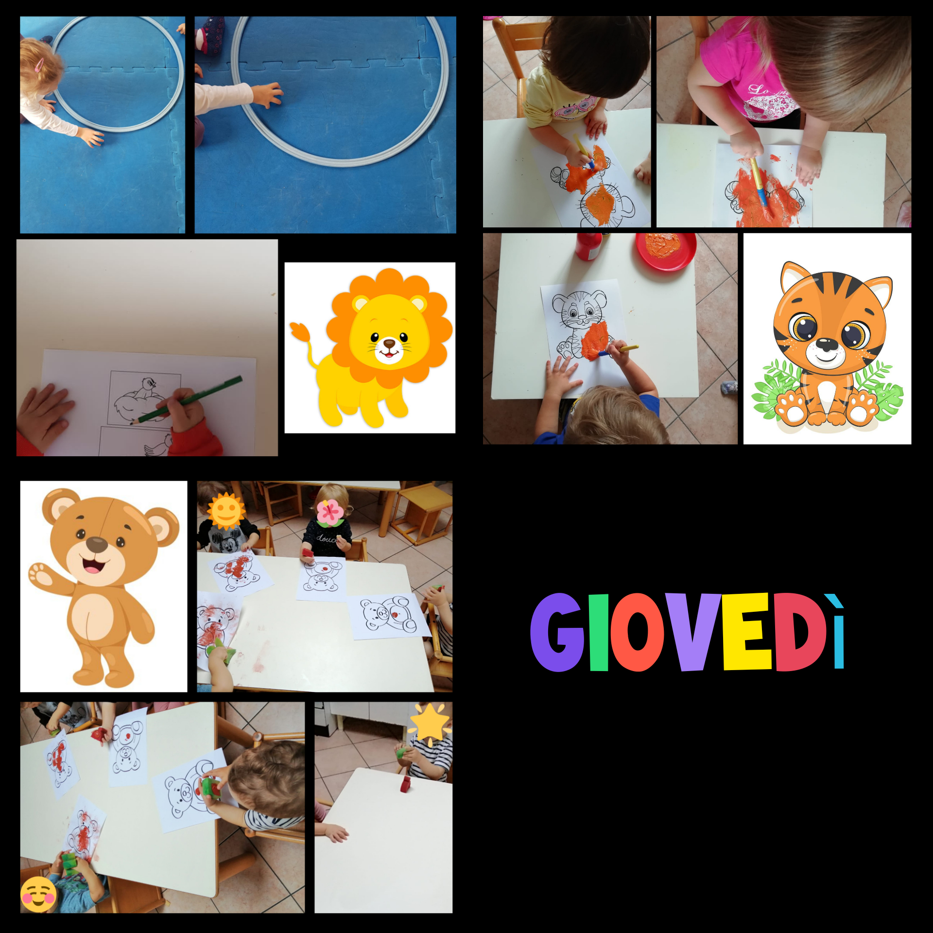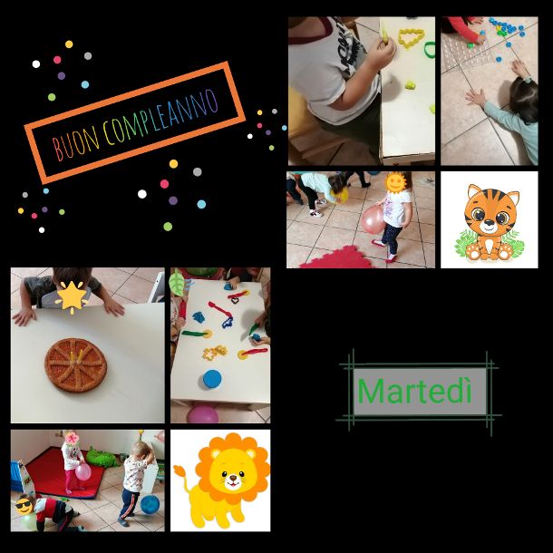 Gruppo LEONCINI e Gruppo TIGROTTI → Oggi qualcuno tra noi spegne due candeline e per questo festeggiamo insieme il nostro amico Brian!!! Ci divertiamo tutti insieme a ballare e a giocare con i palloncini. Successivamente, attività di gioco strutturato: ogni bambino sceglie un gioco e poi lo riordina. I giochi proposti sono: manipolare il pongo, il gioco degli incastri e i chiodini colorati. I bambini si trovano impegnati in diverse attività che gli permette di sviluppare diverse abilità da quelle manuali, a quelle che richiedono attenzione e precisione.