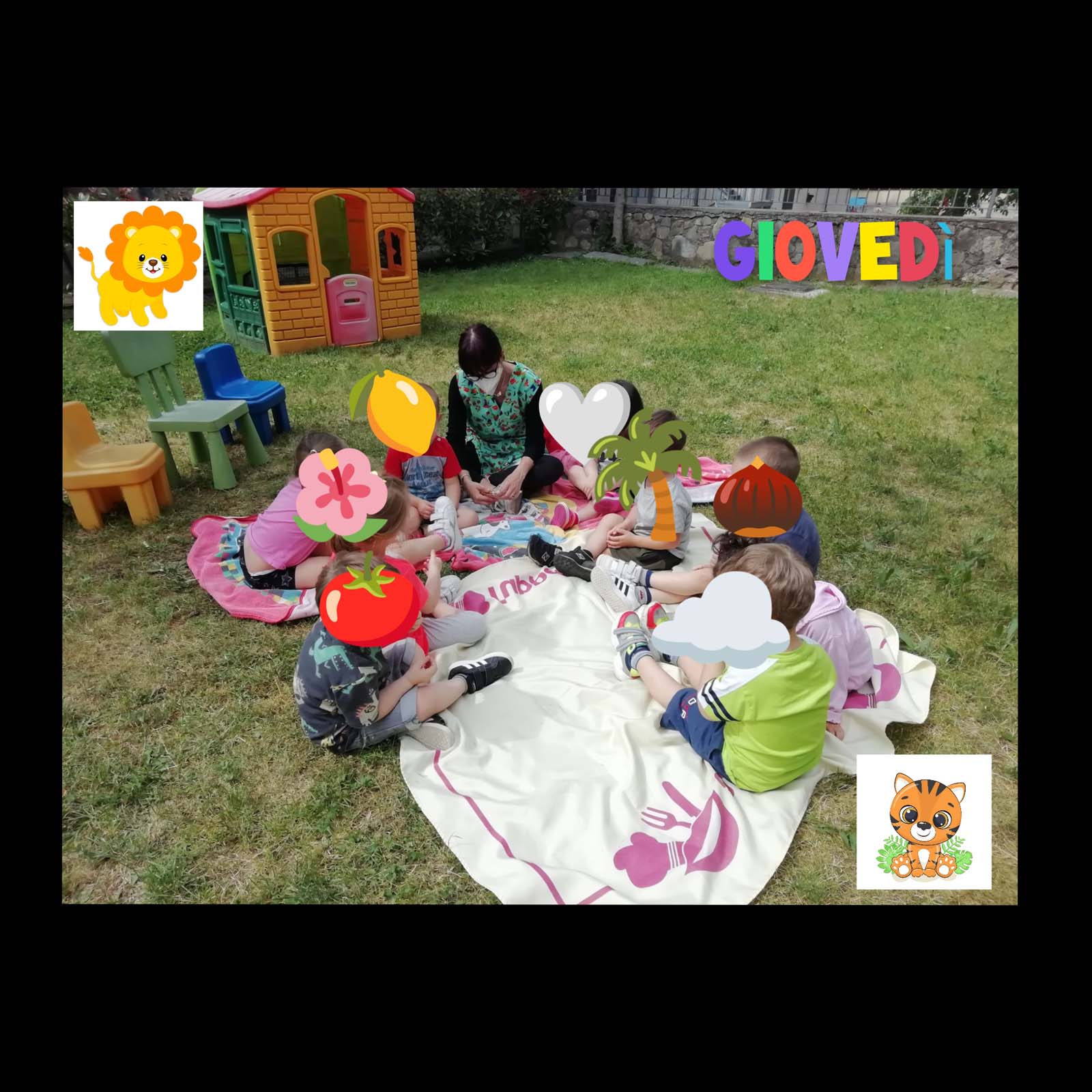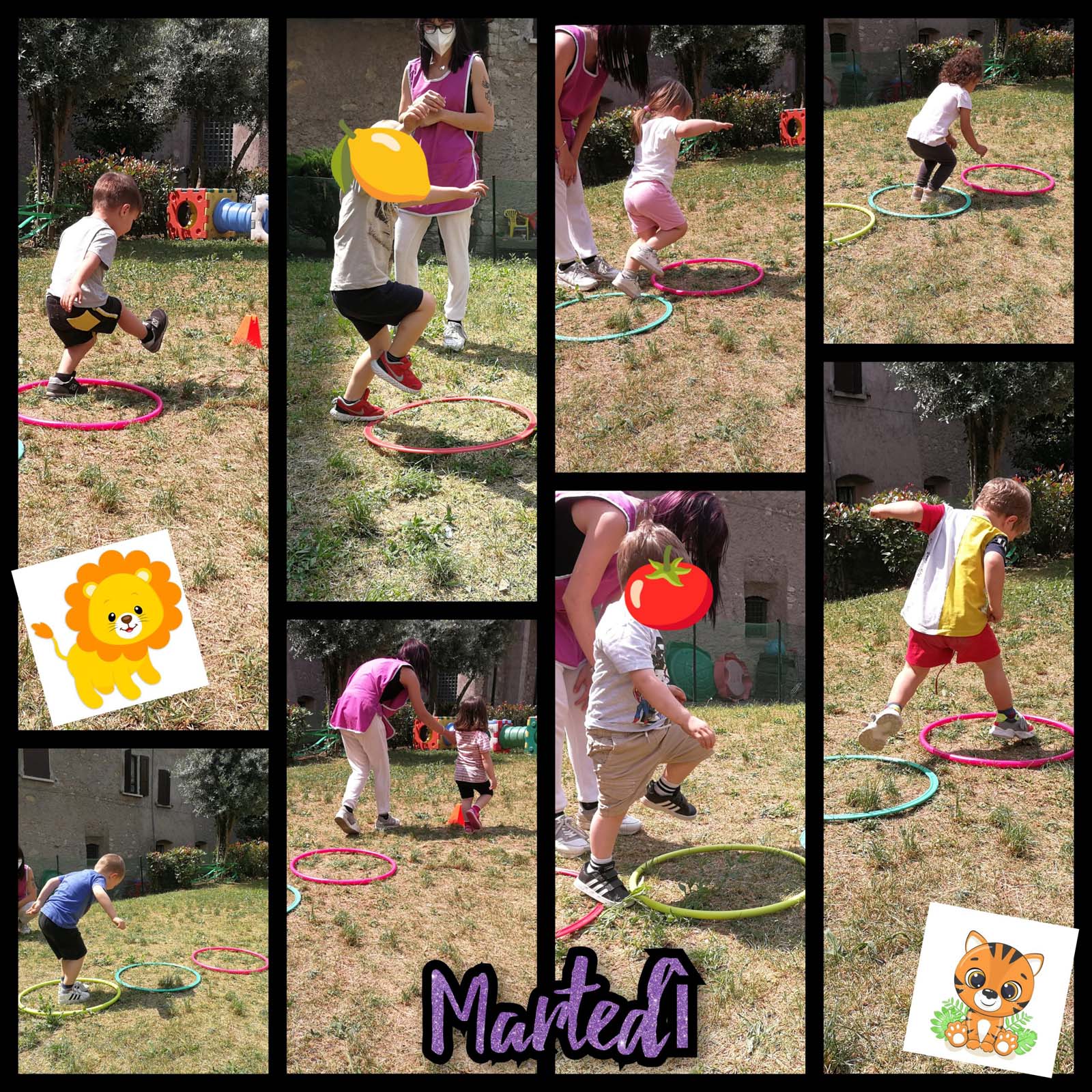 Gruppo leoncini e tigrotti attività fisica: oggi in giardino facciamo ginnastica, saltiamo nei cerchi e giriamo intorno al cono