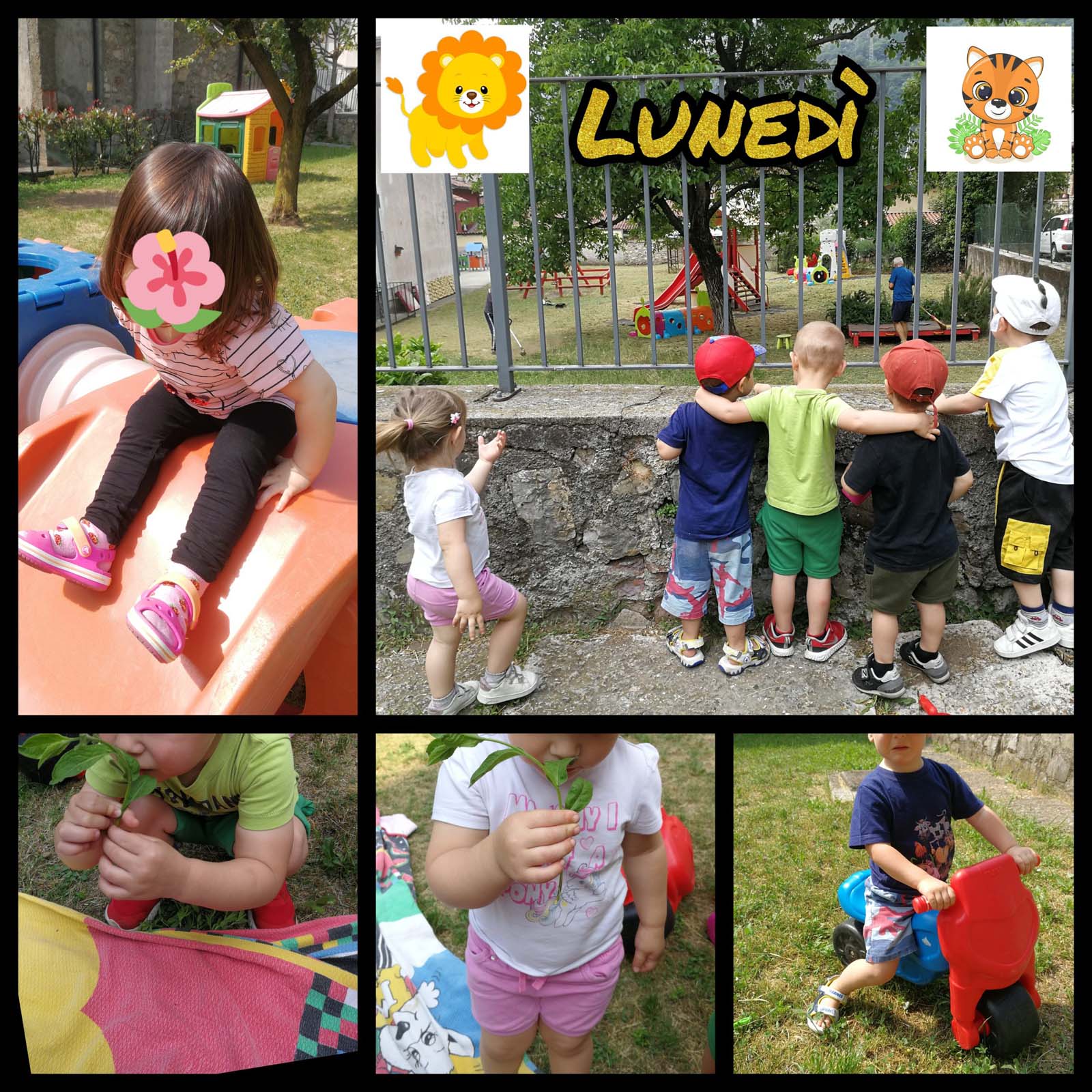 Gruppo leoncini e tigrotti attività sensoriale all’aria aperta: guardiamo il taglia erba e poi annusiamo il profumo delle foglie del nostro giardino