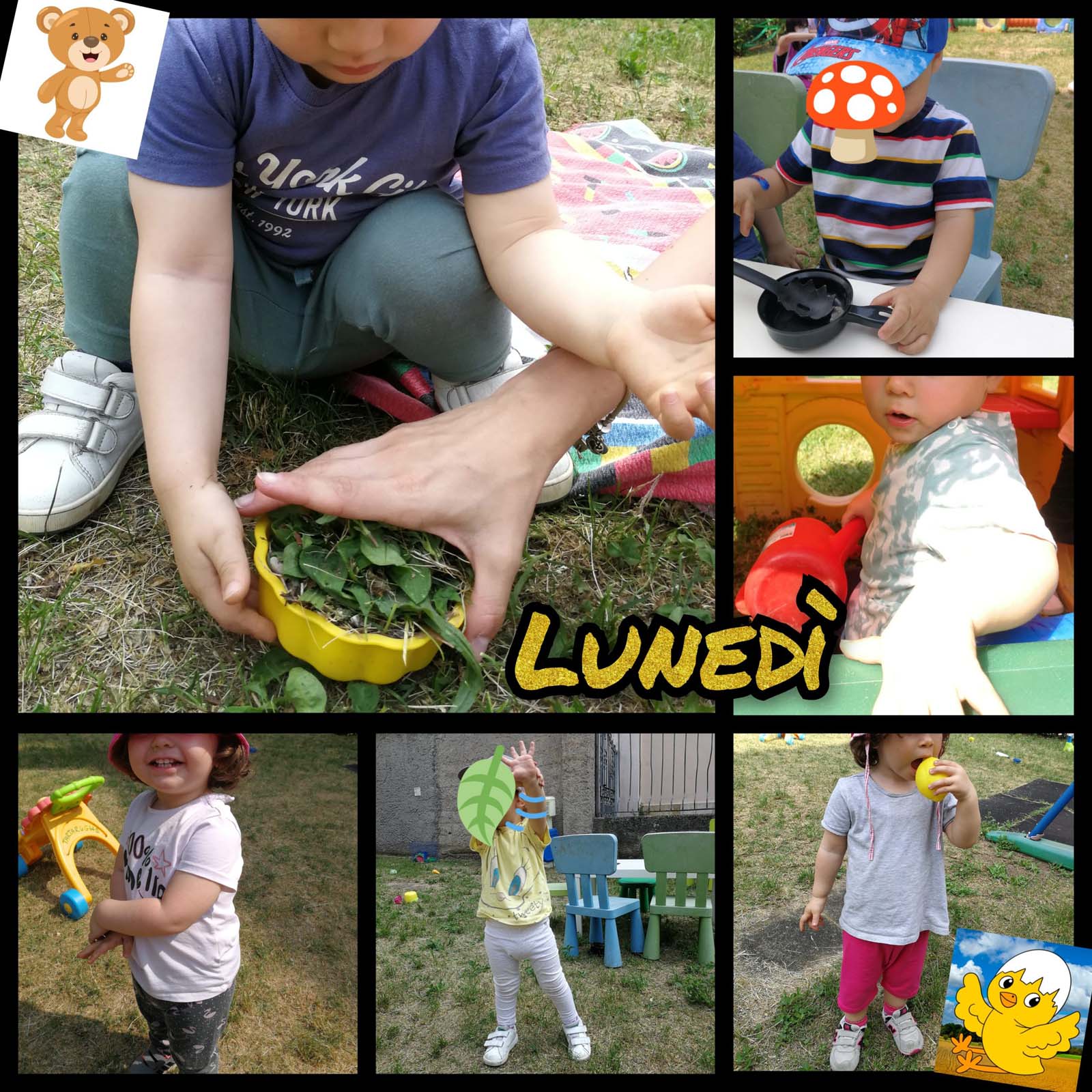 Gruppo orsetti e pulcini attività all’aria aperta: oggi scendiamo a giocare in giardino e su i piccini suonano gli strumenti