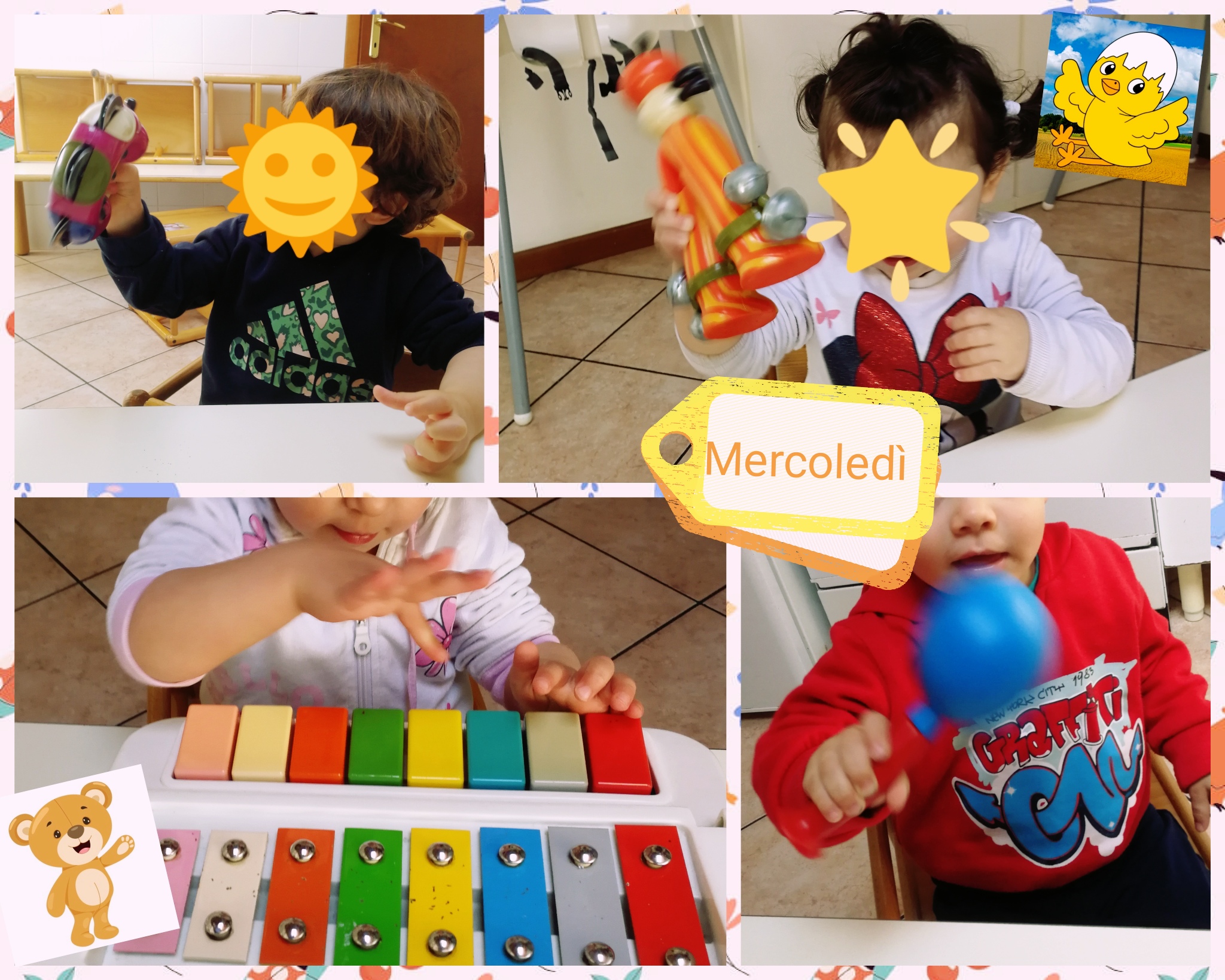 Gruppo orsetti e pulcini attività musicale: dopo che ciascuno ha sperimentato il singolo strumento, suoniamo tutti insieme distinguendo il suono piano e forte.