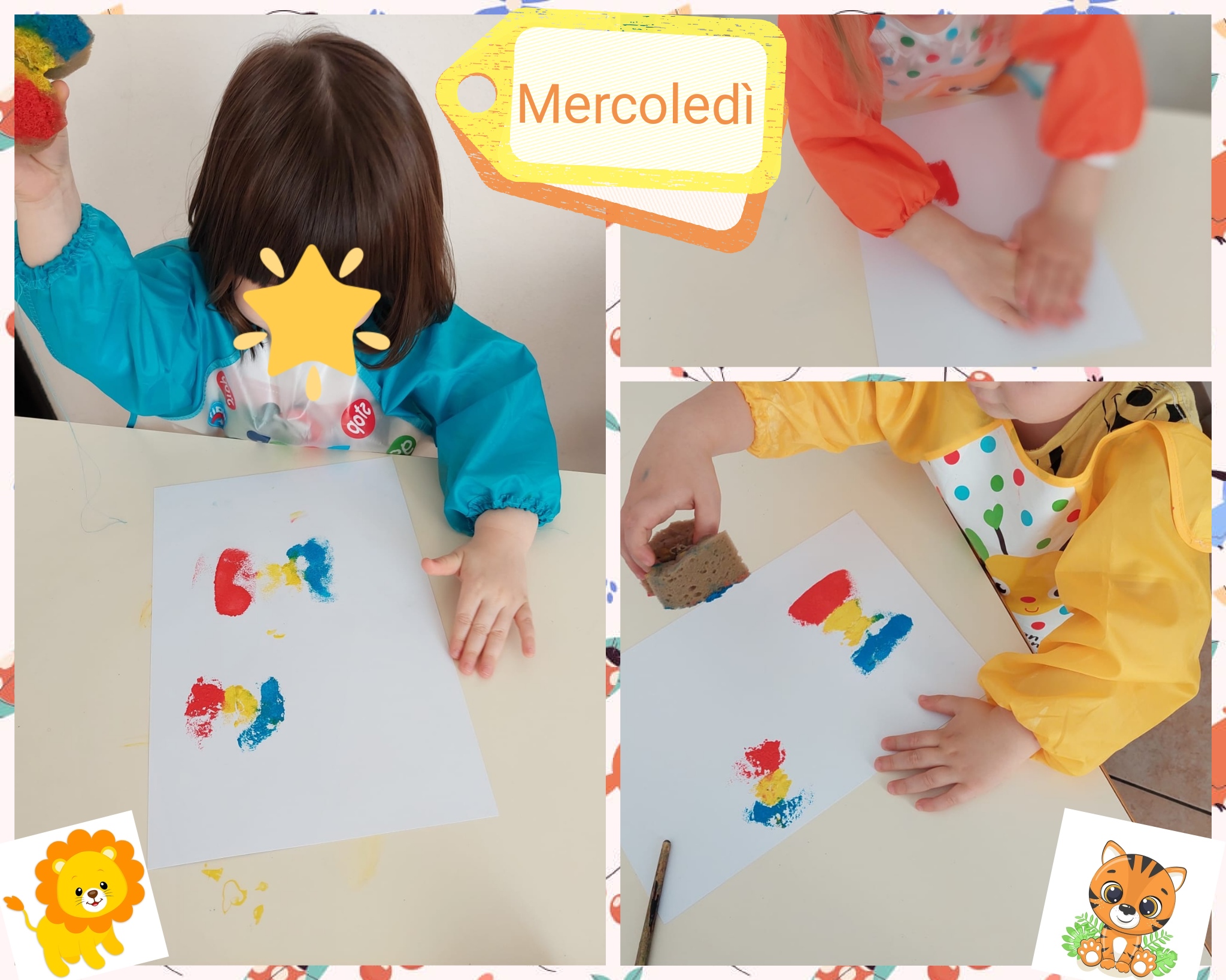 Gruppo leoncini e tigrotti attività espressiva: oggi prepariamo delle bellissime farfalle utilizzando la tempera e la spugna.