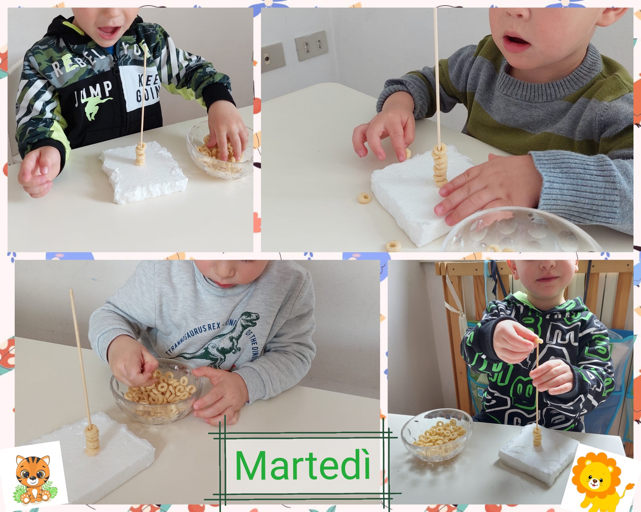 Gruppo leoncini e tigrotti attività manuale fine: con molta attenzione e pazienza inseriamo i cereali nella bacchetta di legno.