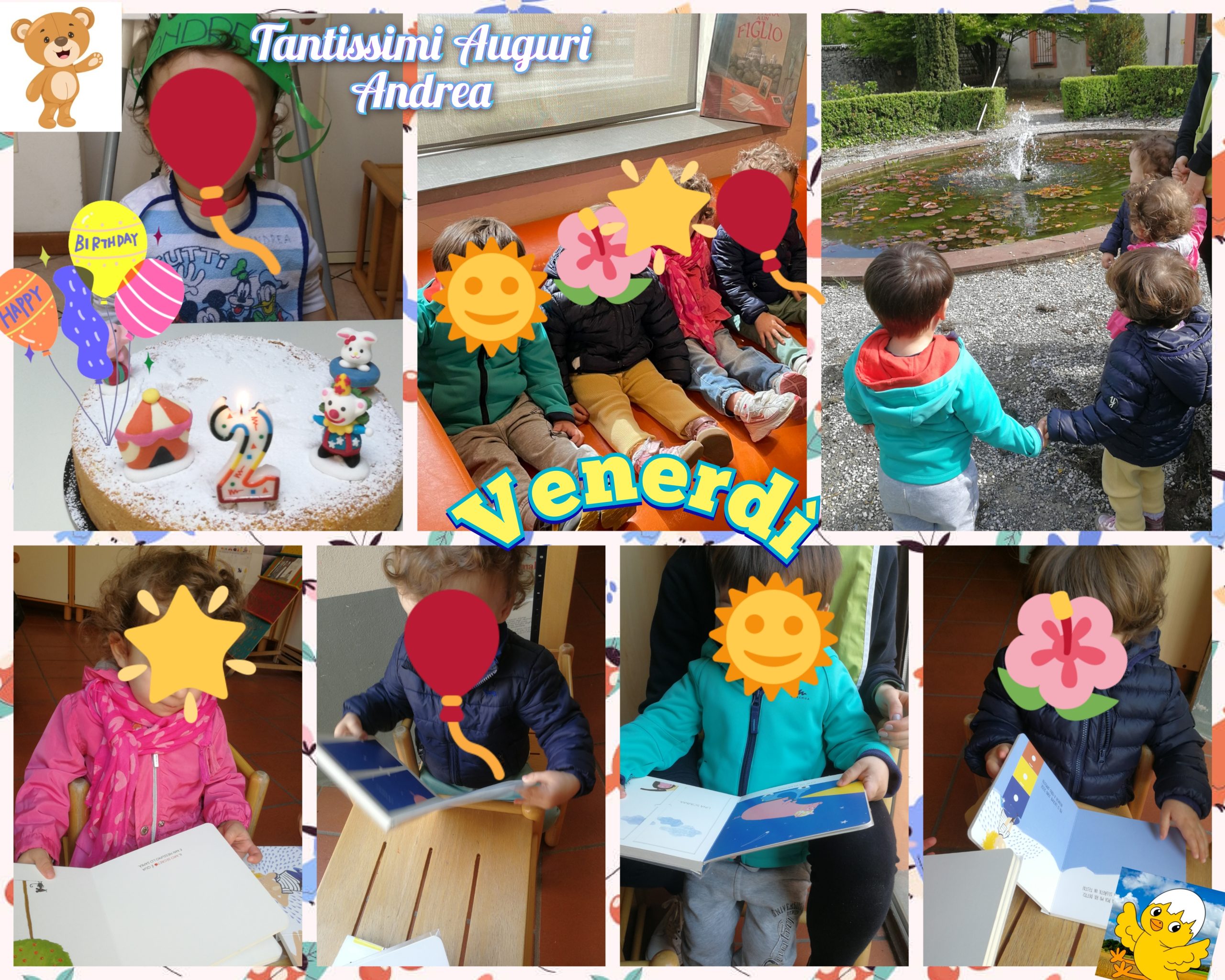 Gruppo orsetti e pulcini tantissimi auguri al nostro amico Andrea, che oggi compie due anni, festeggiamo il suo compleanno e poi gruppo orsetti attività fuori porta: andiamo in biblioteca, scopriamo questo ambiente, ci sediamo sul divano e leggiamo delle storie. Poi scopriamo il giardino con il laghetto.