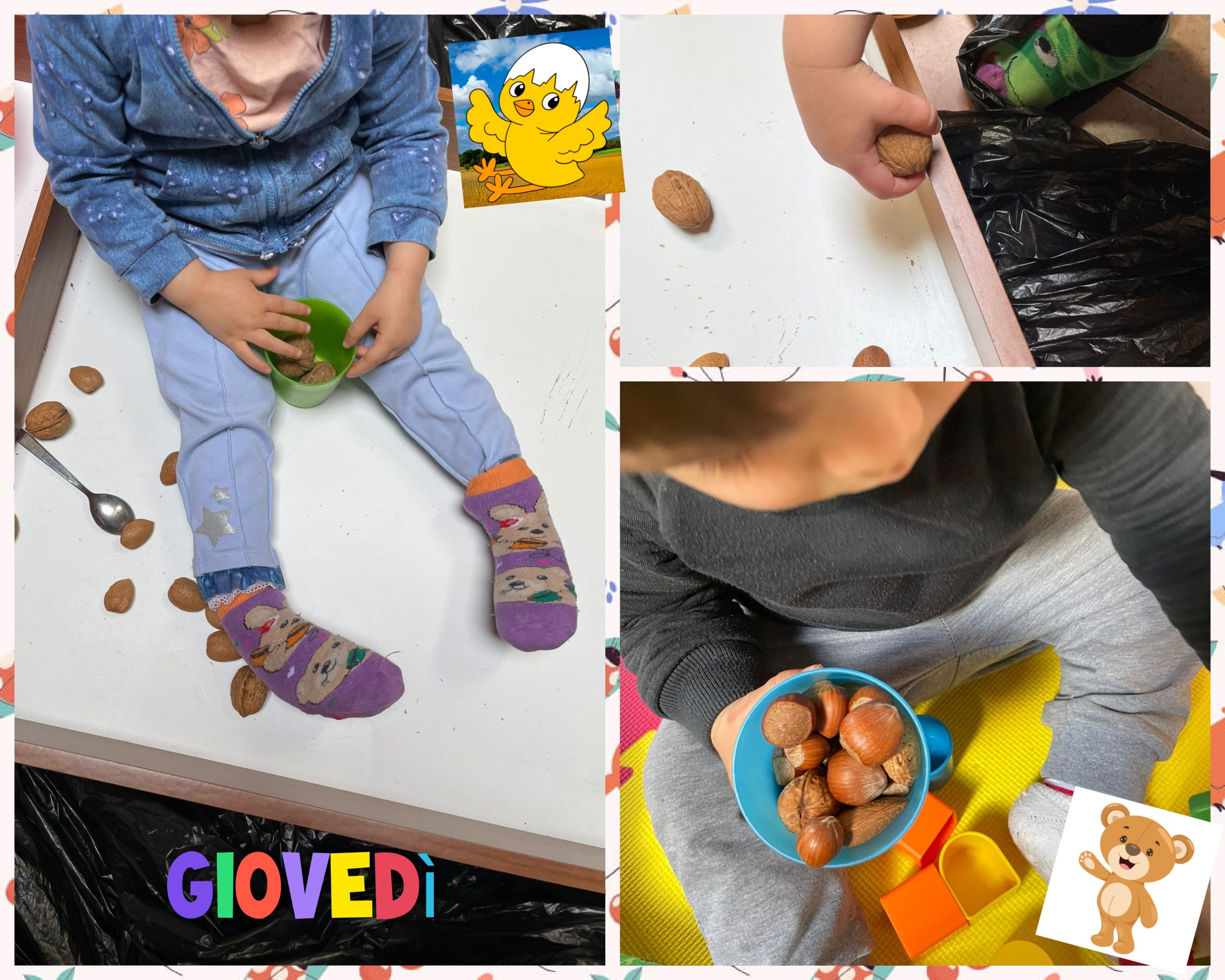Gruppo orsetti e pulcini attività di travasi: oggi facciamo i travasi con le noci e le nocciole, utilizzando cucchiai e ciotoline.