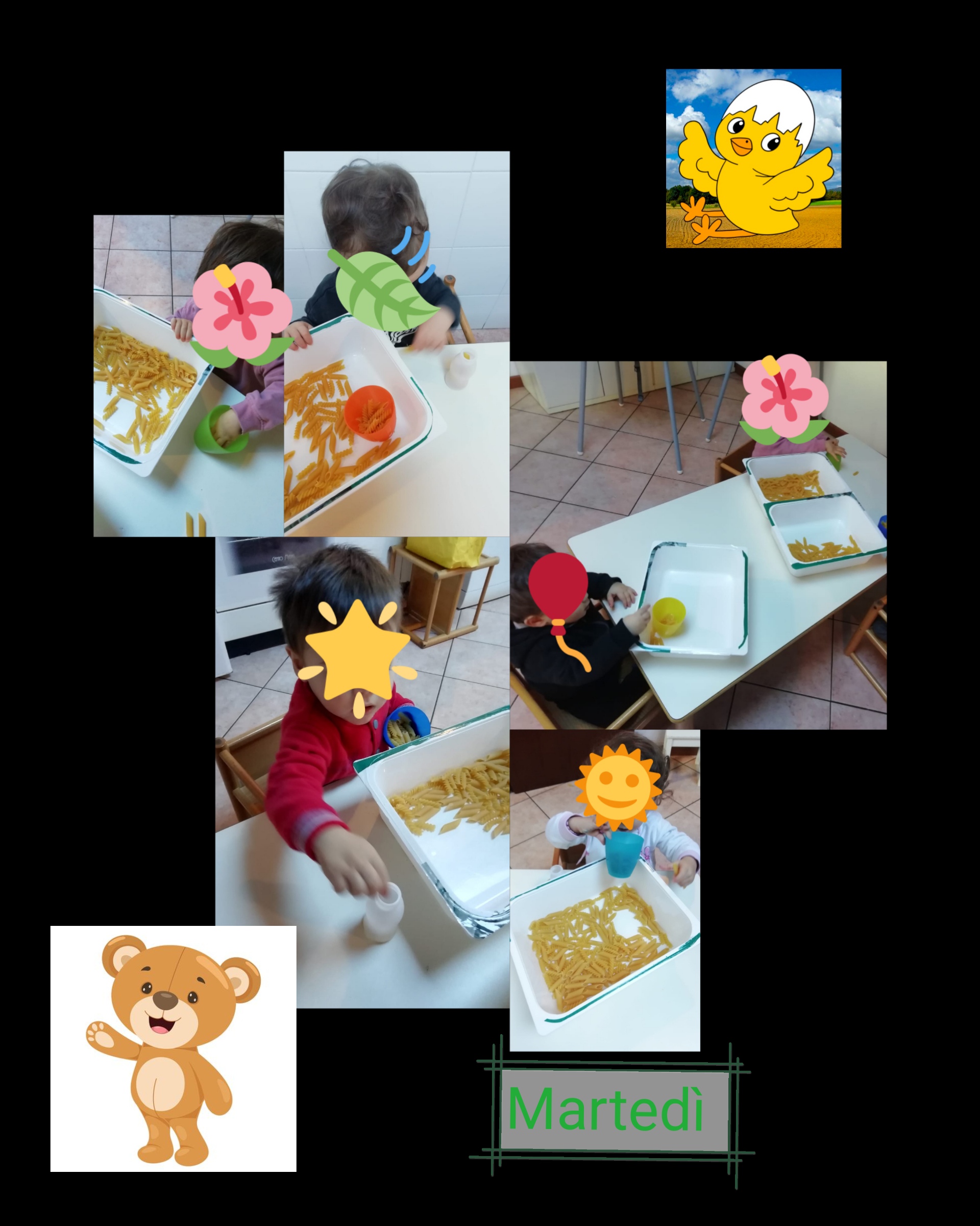 Gruppo orsetti e pulcini attività di travasi: ciascun bambino ha il suo contenitore con della pasta e attraverso ciotoline o bottigliette allena la sua attenzione e concentrazione travasando la pasta.