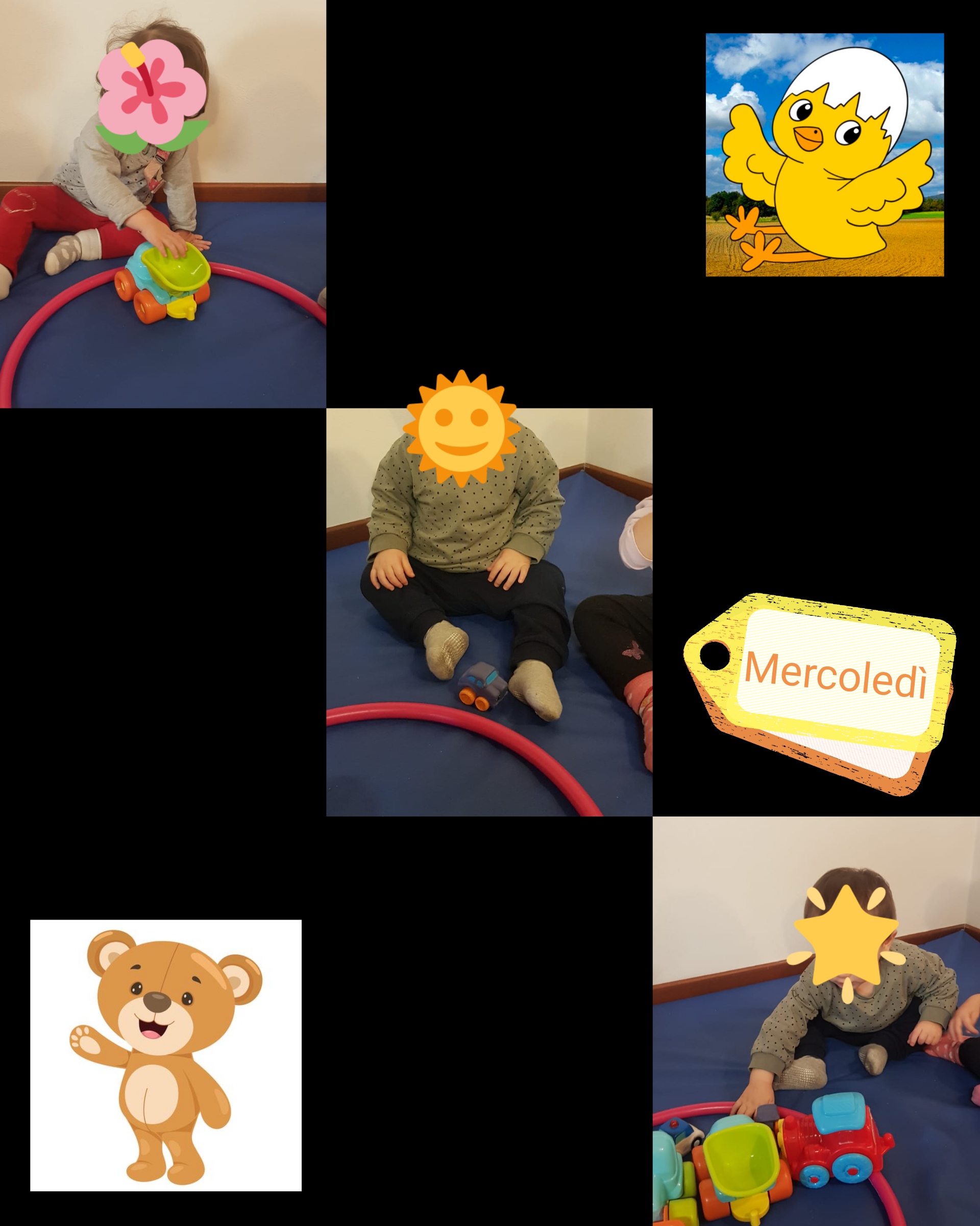 Gruppo orsetti e pulcini attività di riconoscimento: oggi ci alleniamo con i concetti topologici del dentro e del fuori, grazie all’utilizzo del cerchio che delimita lo spazio i bambini acquisiscono tale consapevolezza sperimentandosi.