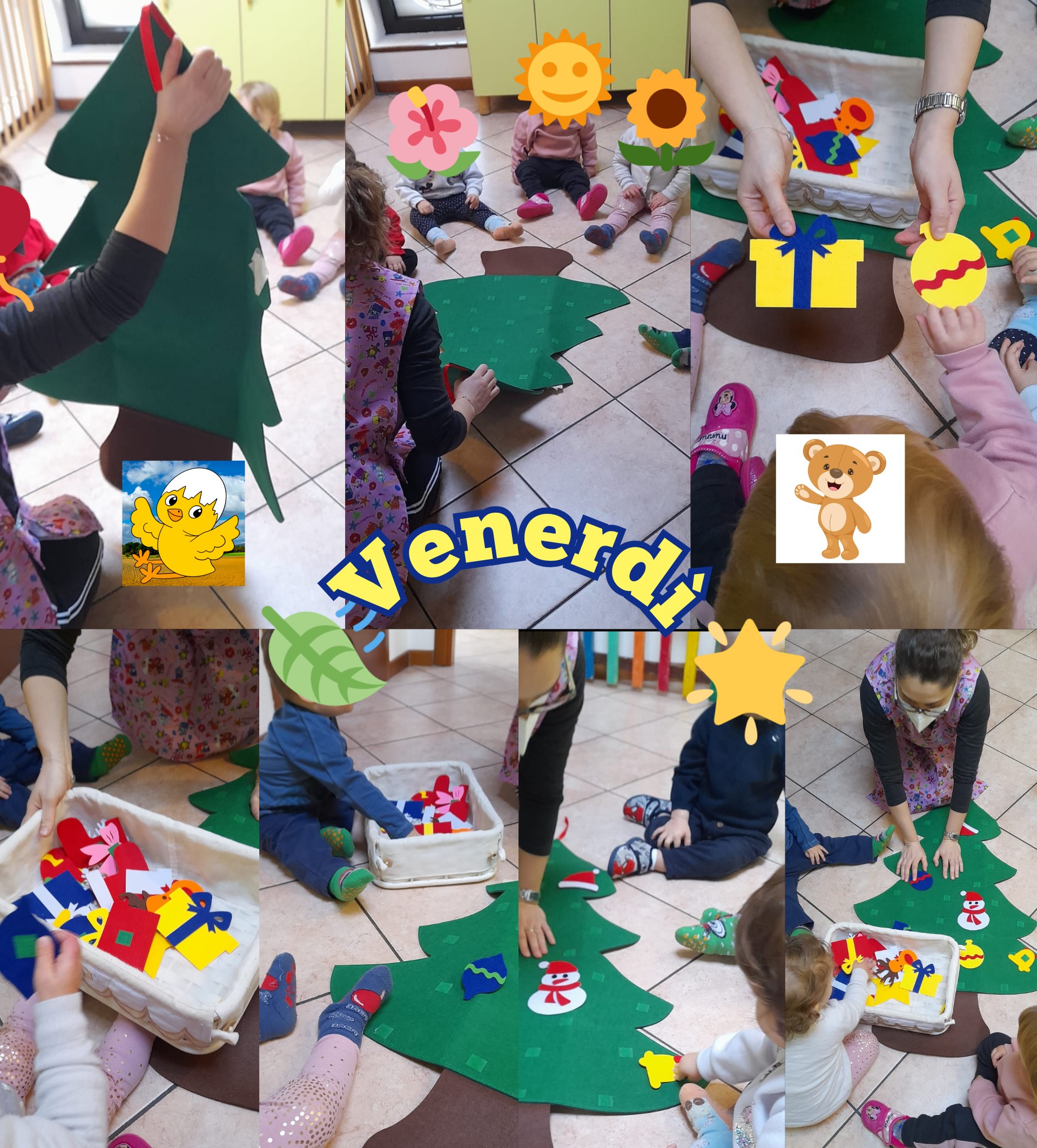 Gruppo orsetti e pulcini attività creativa: oggi decoriamo l’albero di natale in feltro, tocchiamo quanto è morbido e caldo, scopriamo le diverse decorazioni. Ciascun bambino sceglie le decorazioni che preferisce e poi le posiziona sull’albero.