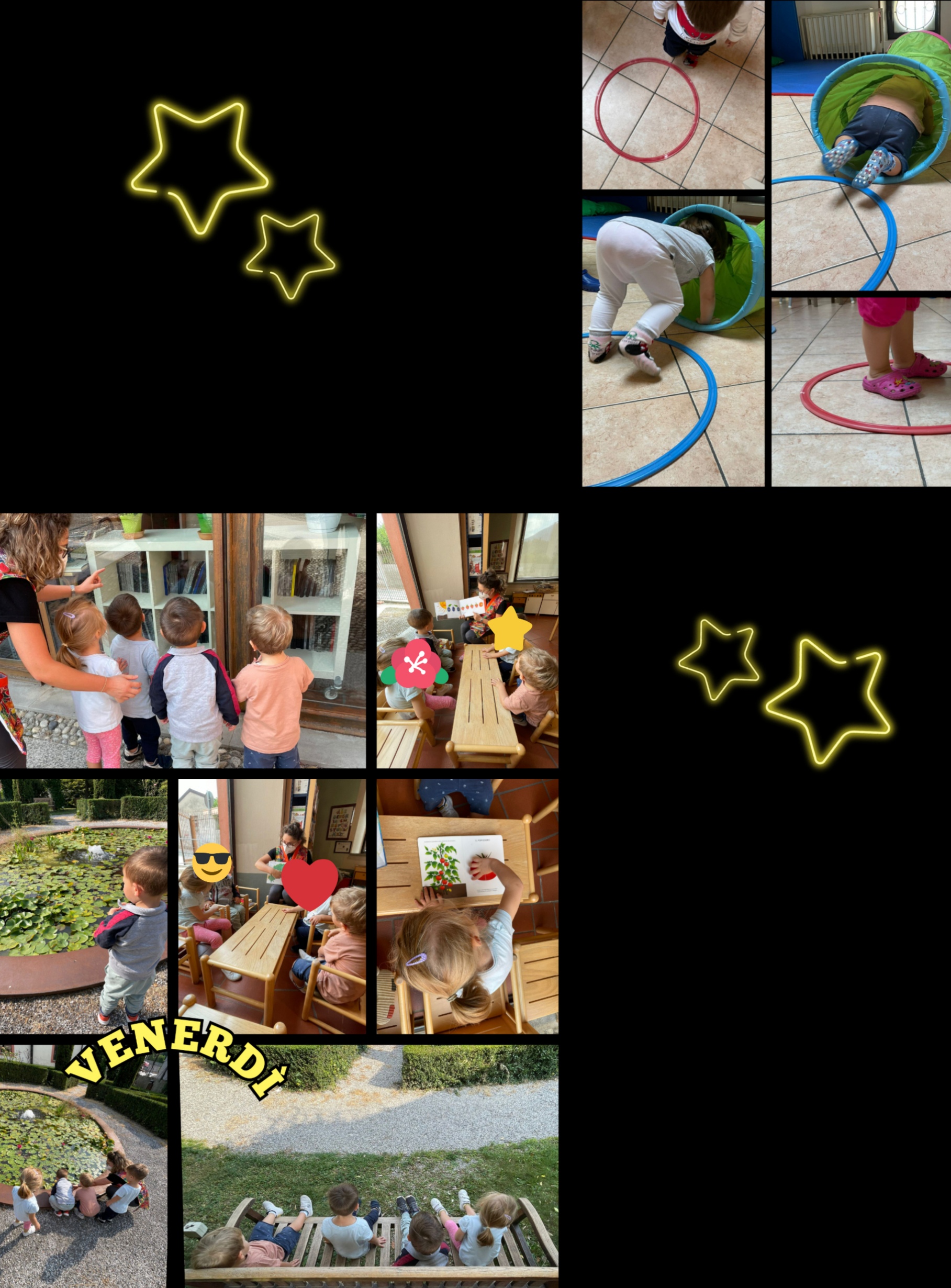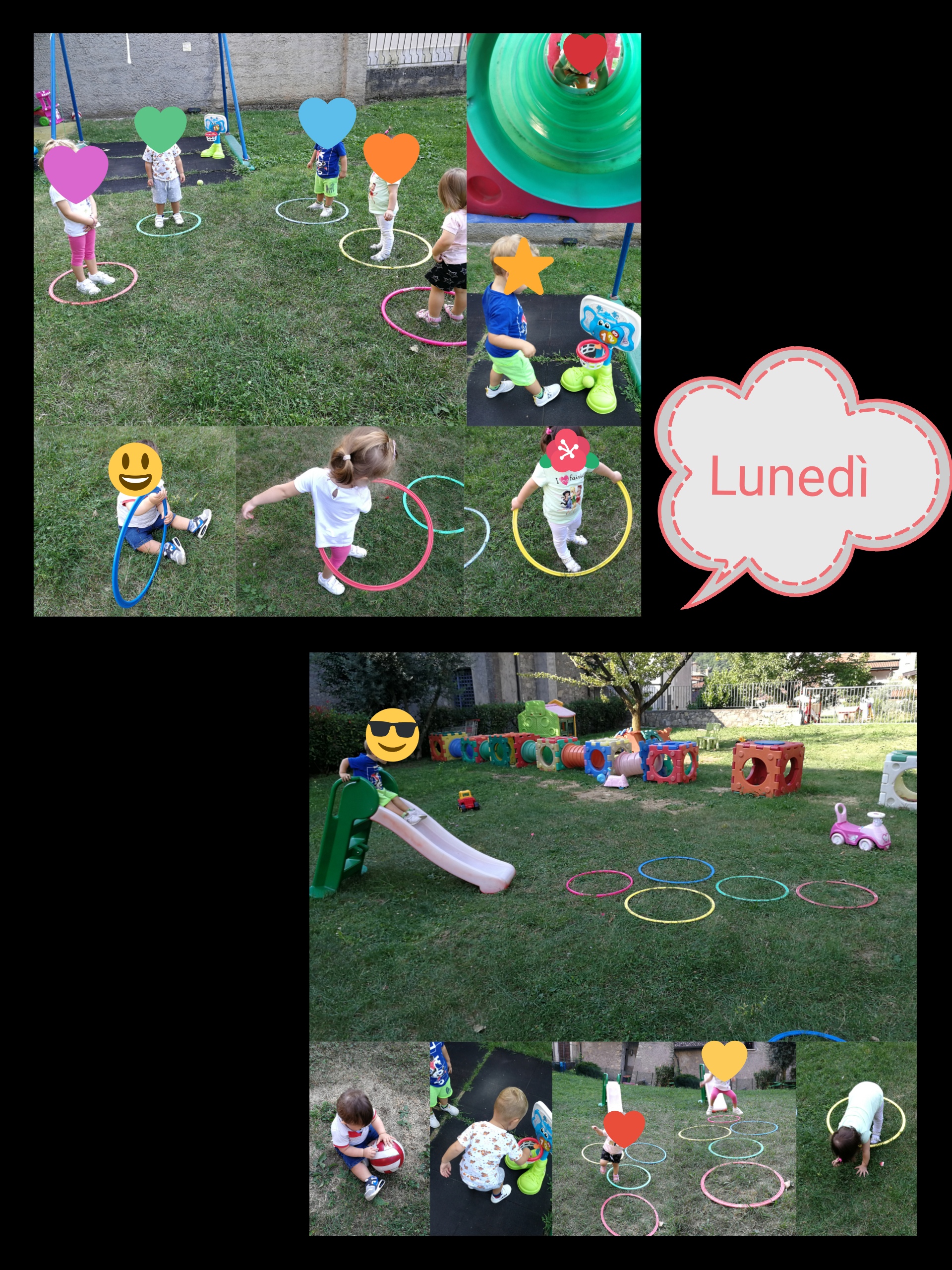 Attività motoria: giochiamo a palla e percorriamo il percorso strutturato (scivolo, azioni ad esempio batti le mani, tocca i piedi e salti nel cerchio). I bambini attraverso il percorso conoscono il loro corpo, sperimentano le loro abilità acquisendo una maggiore consapevolezza della loro coordinazione corporea.