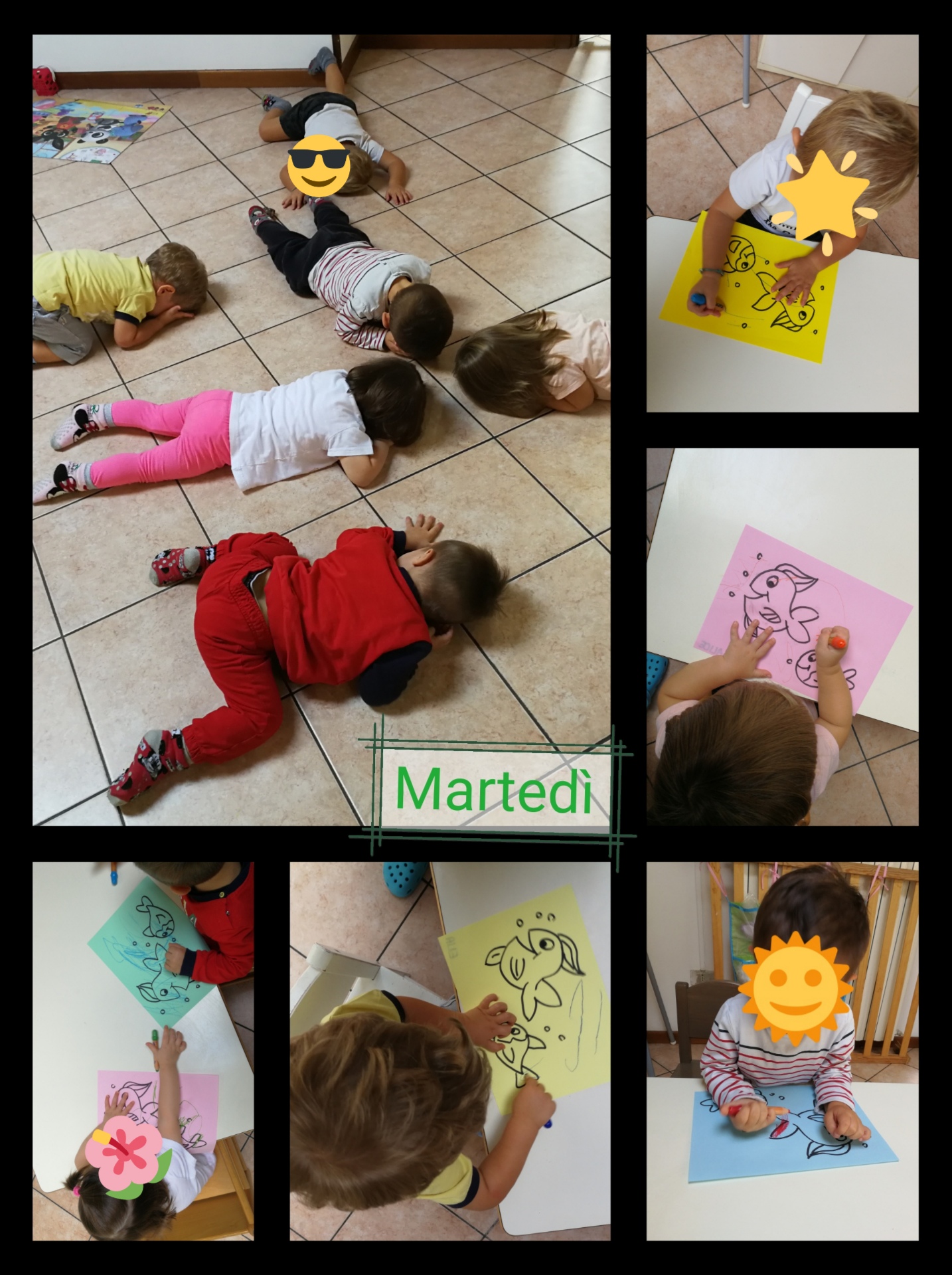 Attività espressiva: oggi abbiamo parlato dell’estate, soprattutto del mare e abbiamo deciso di colorare con i pastelli dei simpatici pesciolini che vivono nel mare. Dopodiché abbiamo giocato al gioco delle scatoline che promuove il movimento dei bambini e il riconoscimento dei versi degli animali!