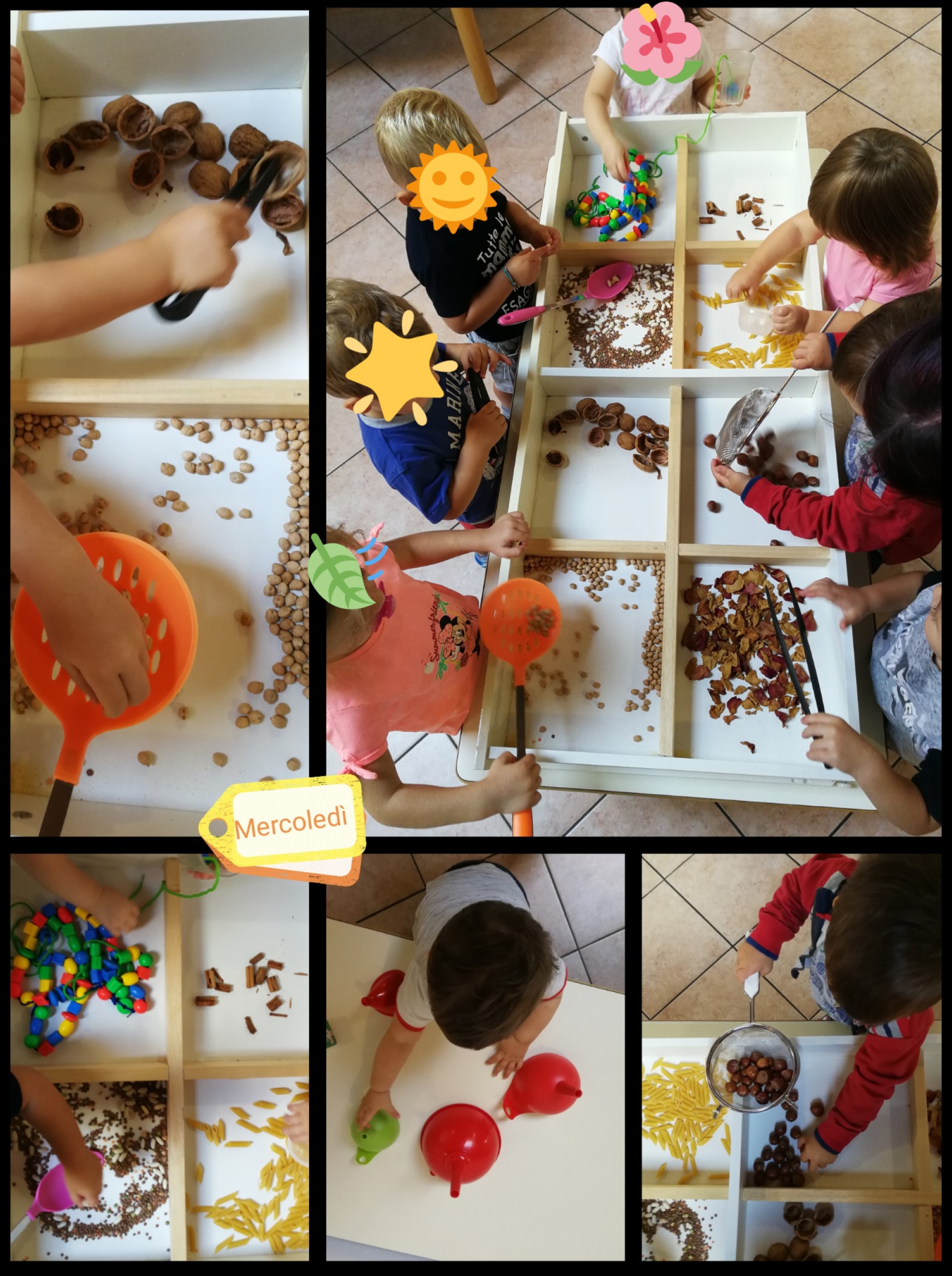 Attività dei travasi: con diversi materiali e attrezzi (pasta, nocciole, noci, biglie colorate, fiori secchi, legumi). Grazie a quest’attività i bambini sperimentano la loro manualità fine, imparano a concentrarsi e creando più postazioni hanno la possibilità di impare a scambiarsi il materiale e aspettare il proprio turno.