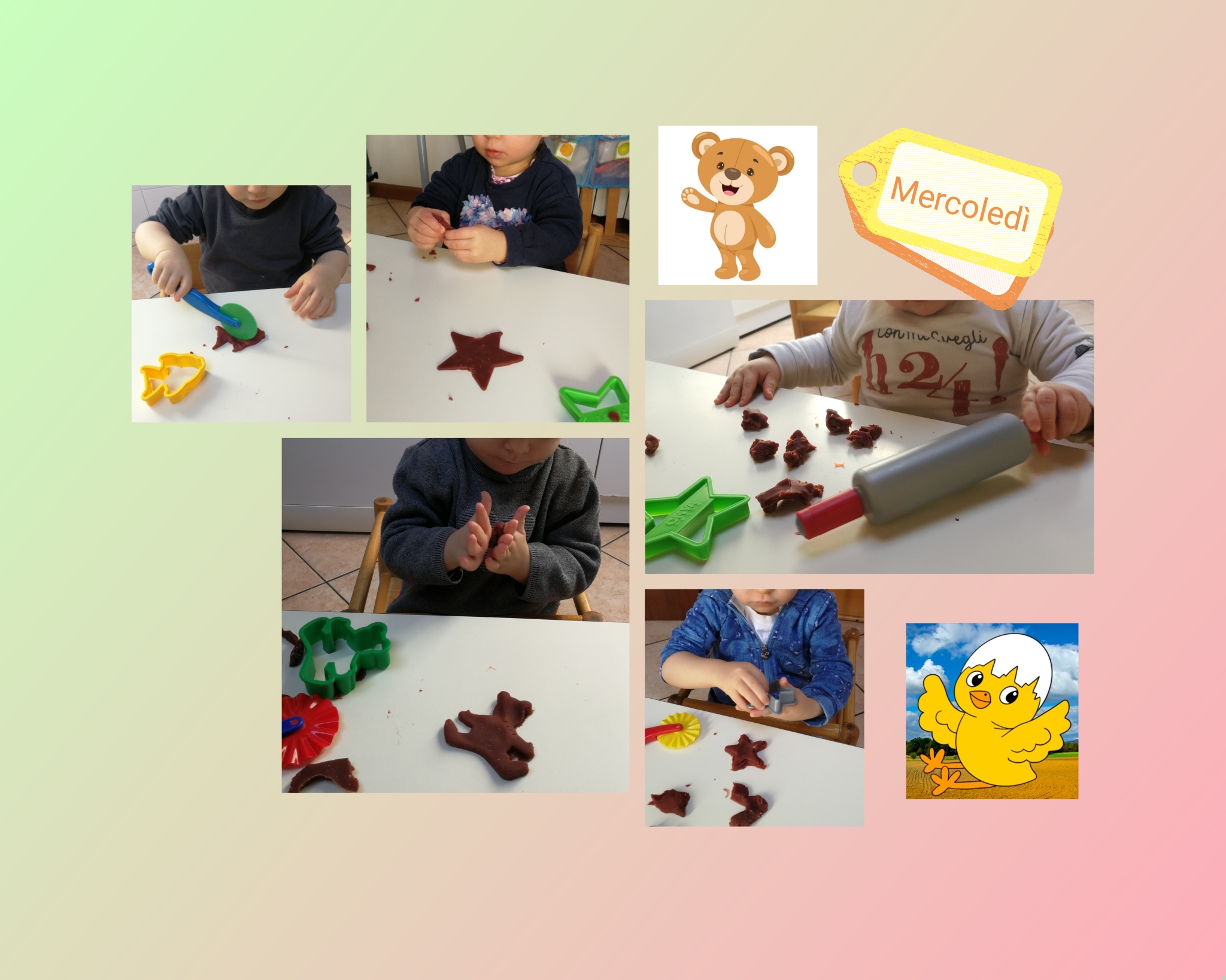 Gruppo orsetti e pulcini attività di manipolazione: ciascun bambino ha del pongo, delle formine e degli utensili, liberamente si divertono a dare diverse forme al pongo, a modellarlo sviluppando la loro abilità manuale.