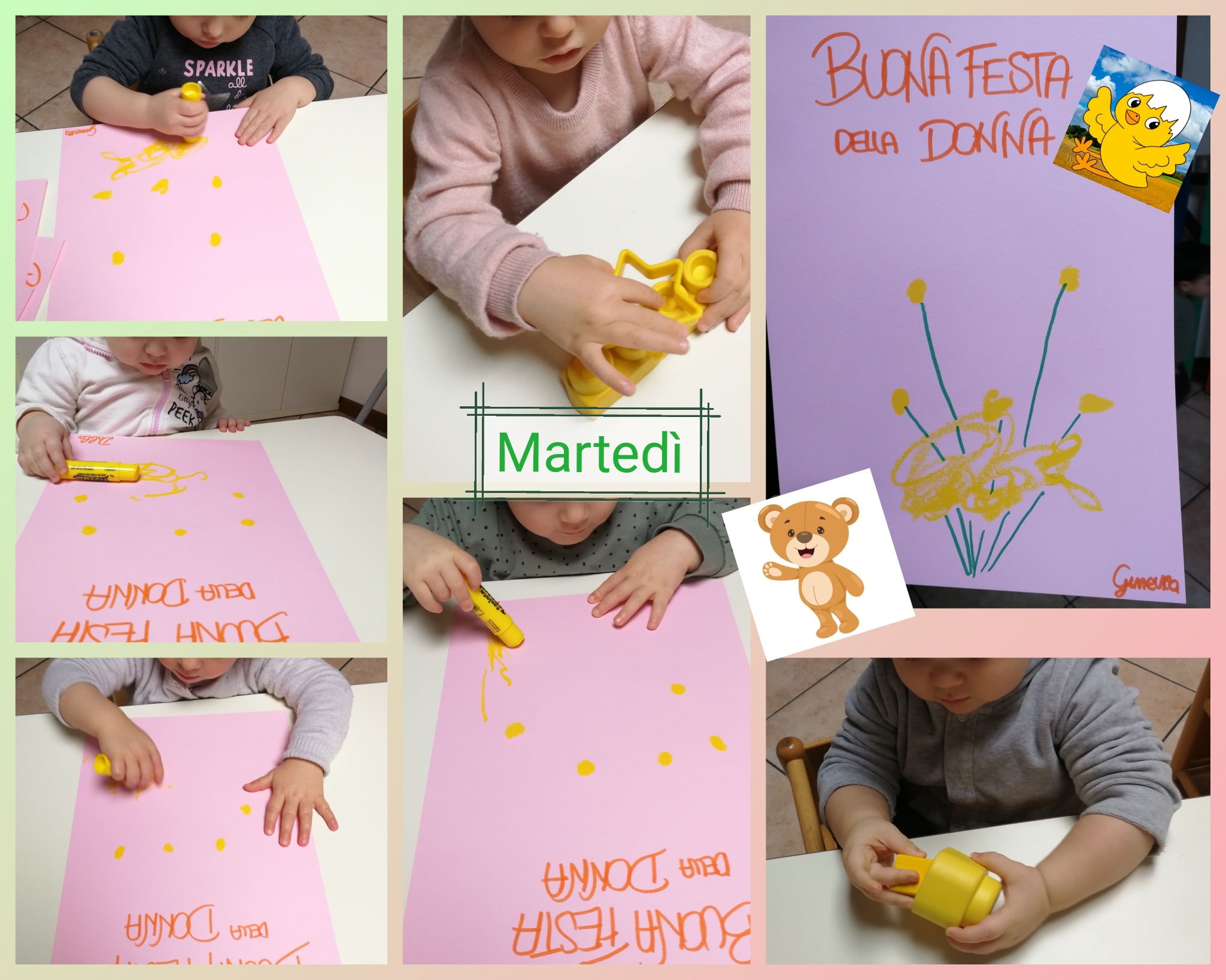 Gruppo orsetti e pulcini attività espressiva e classificazione dei colori: i bambini oggi conoscono in particolare il colore giallo, classificano gli oggetti di questo colore e poi preparano la mimosa per la festa della donna