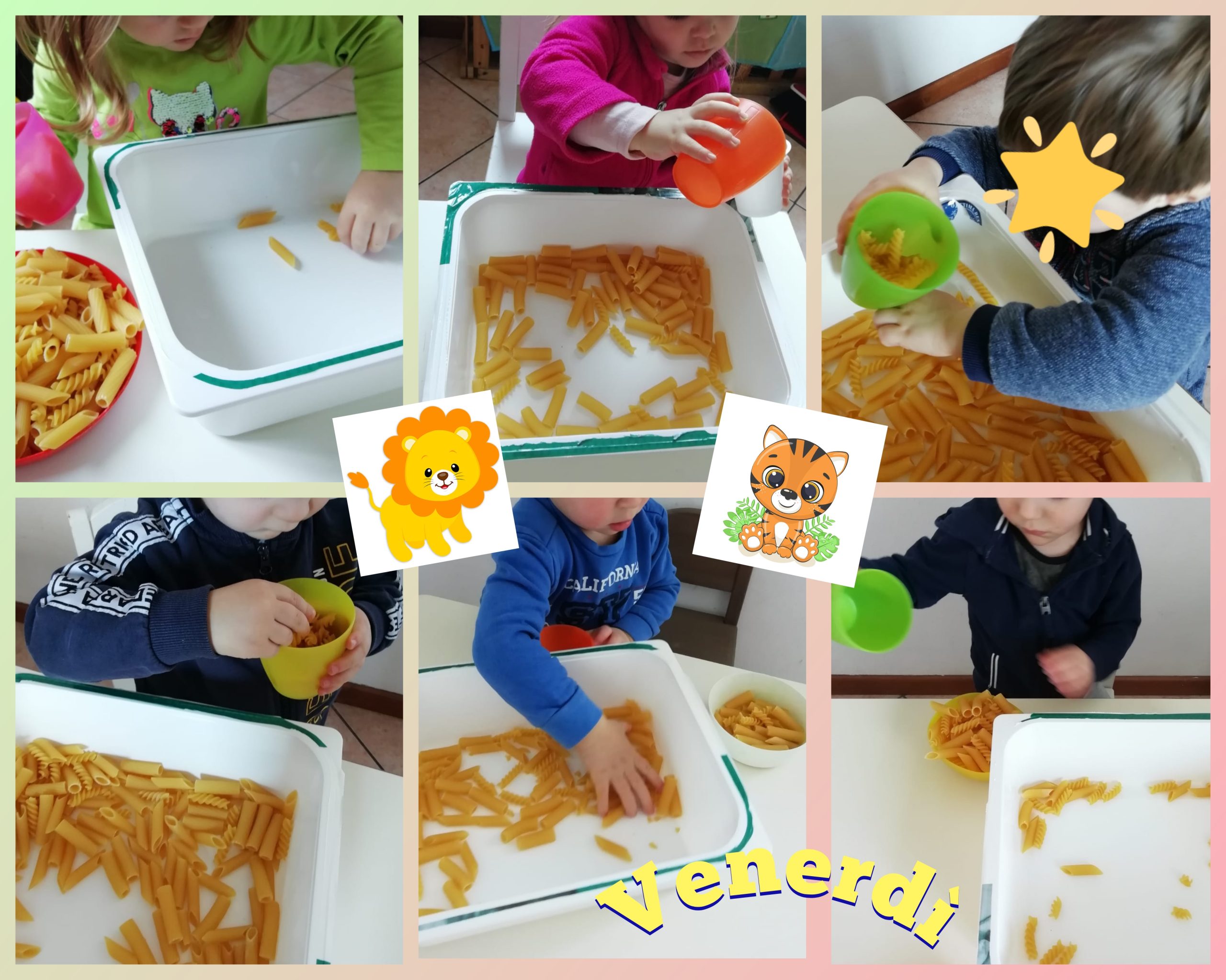 Gruppo leoncini e tigrotti attività travasi e classificazione: selezioniamo le varie forme di pasta e la separiamo (fusilli e pennette)