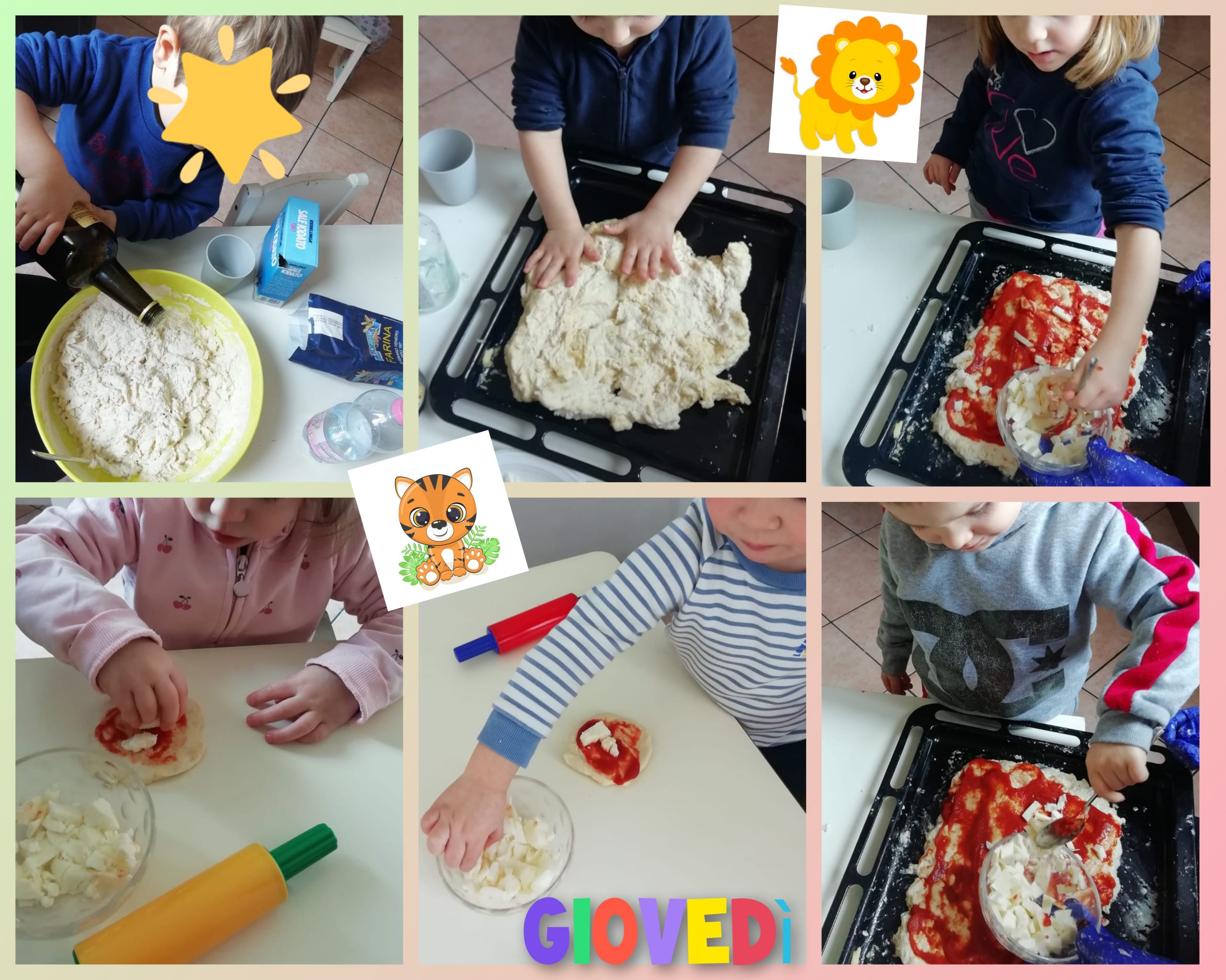 Gruppo leoncini e tigrotti attività sensoriale: impastiamo e facciamo tutti insieme una grande pizza, mettendo pomodoro e mozzarella. Poi ciascuno prepara la sua piccola pizzetta, che bello!