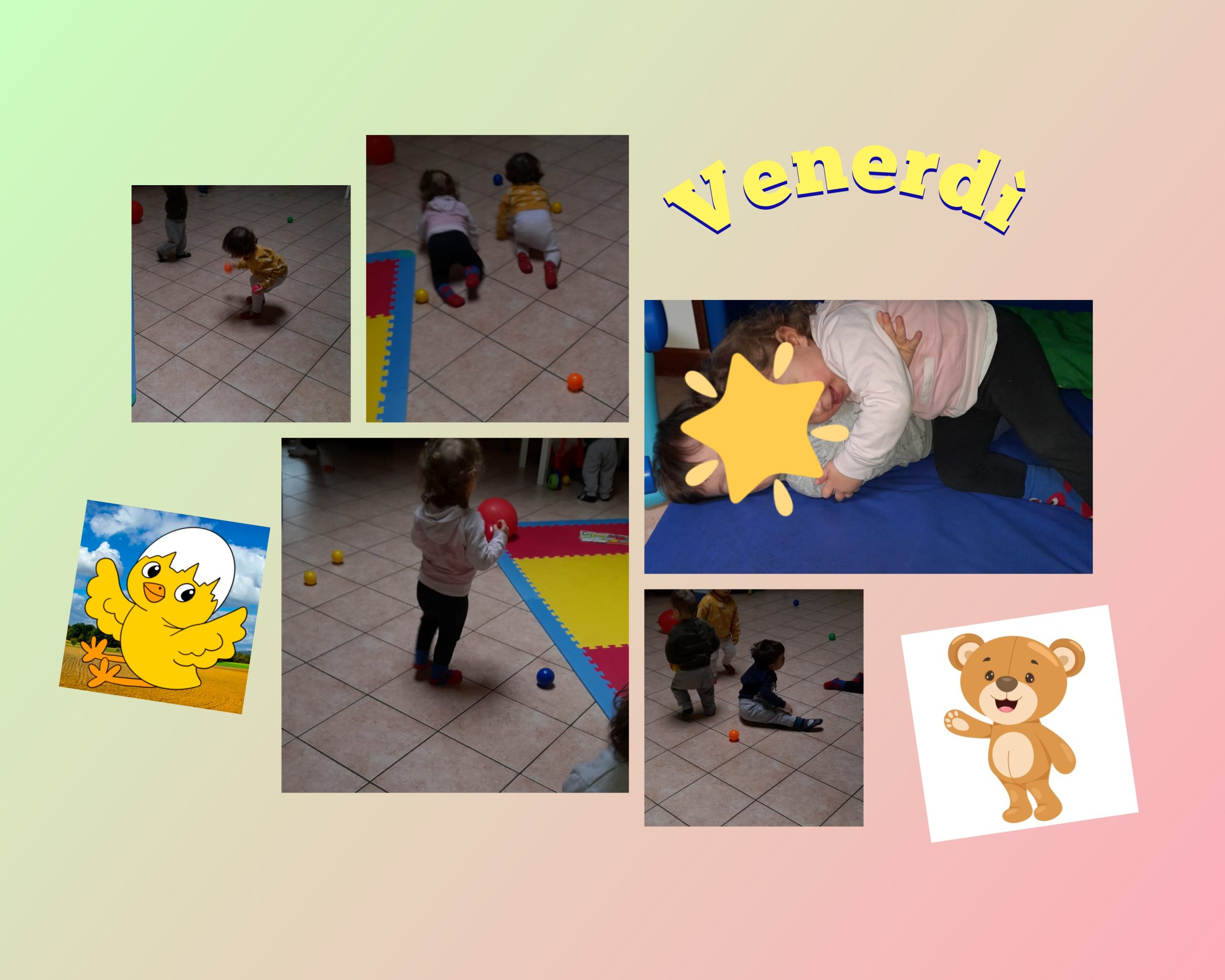 Gruppo orsetti e pulcini attività motoria: oggi facciamo ginnastica, balliamo la canzone “testa, spalle, gambe e piedi”, poi facciamo un pò di movimento con le gambe e le braccia, lanciamo forte le palline colorate.