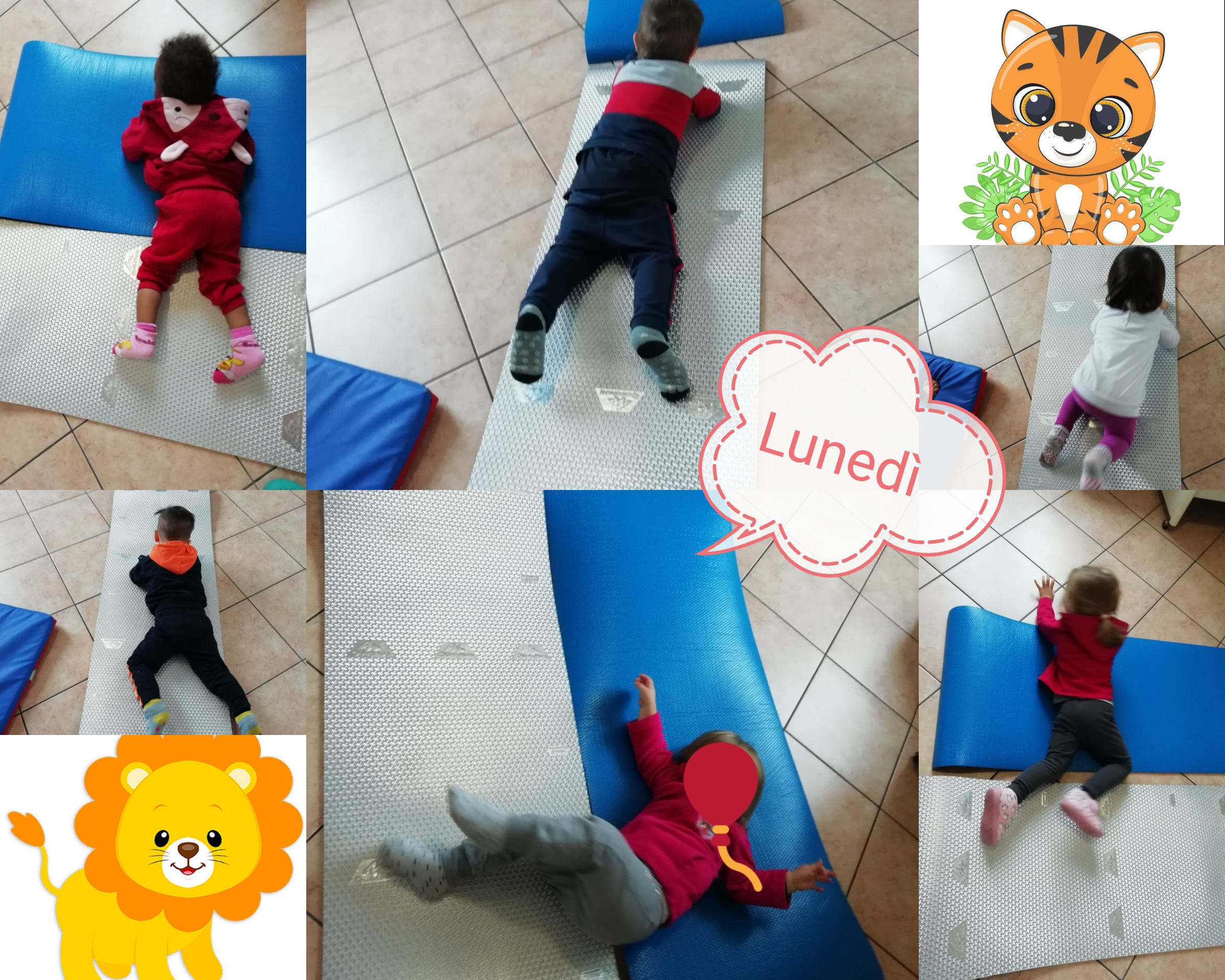 Gruppo leoncini e tigrotti attività motoria: rotoliamo e strisciamo sui tappetini, i bambini imparano ad acquisire consapevolezza del loro corpo e dello spazio