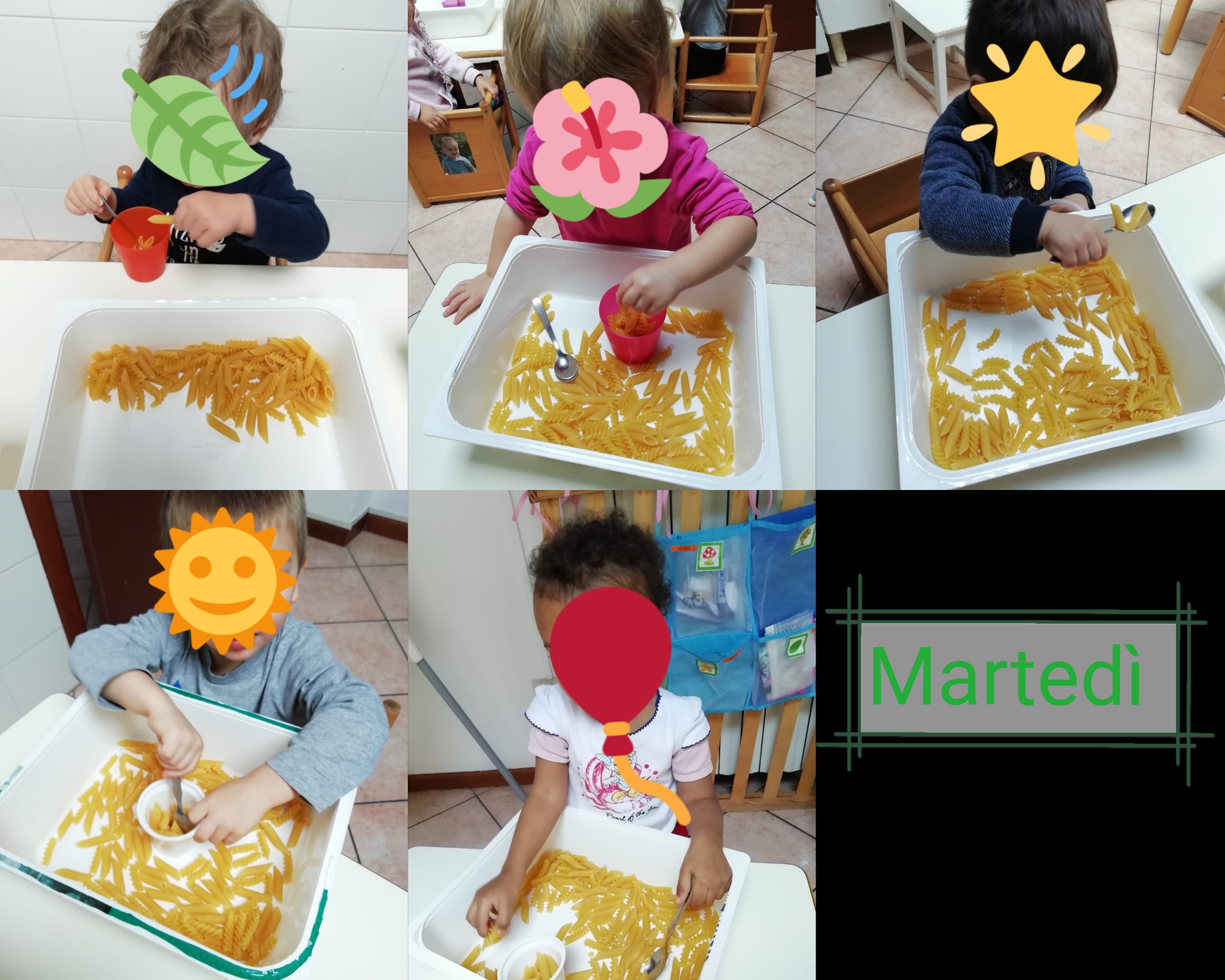 Tutti insieme facciamo attività di travasi: ciascun bambino ha la sua scatola e degli utensili (cucchiaio, imbuto, mestolo), grazie a quest’attività il bambino sviluppa la sua motricità fine e si abitua a concentrarsi su un’attività.
