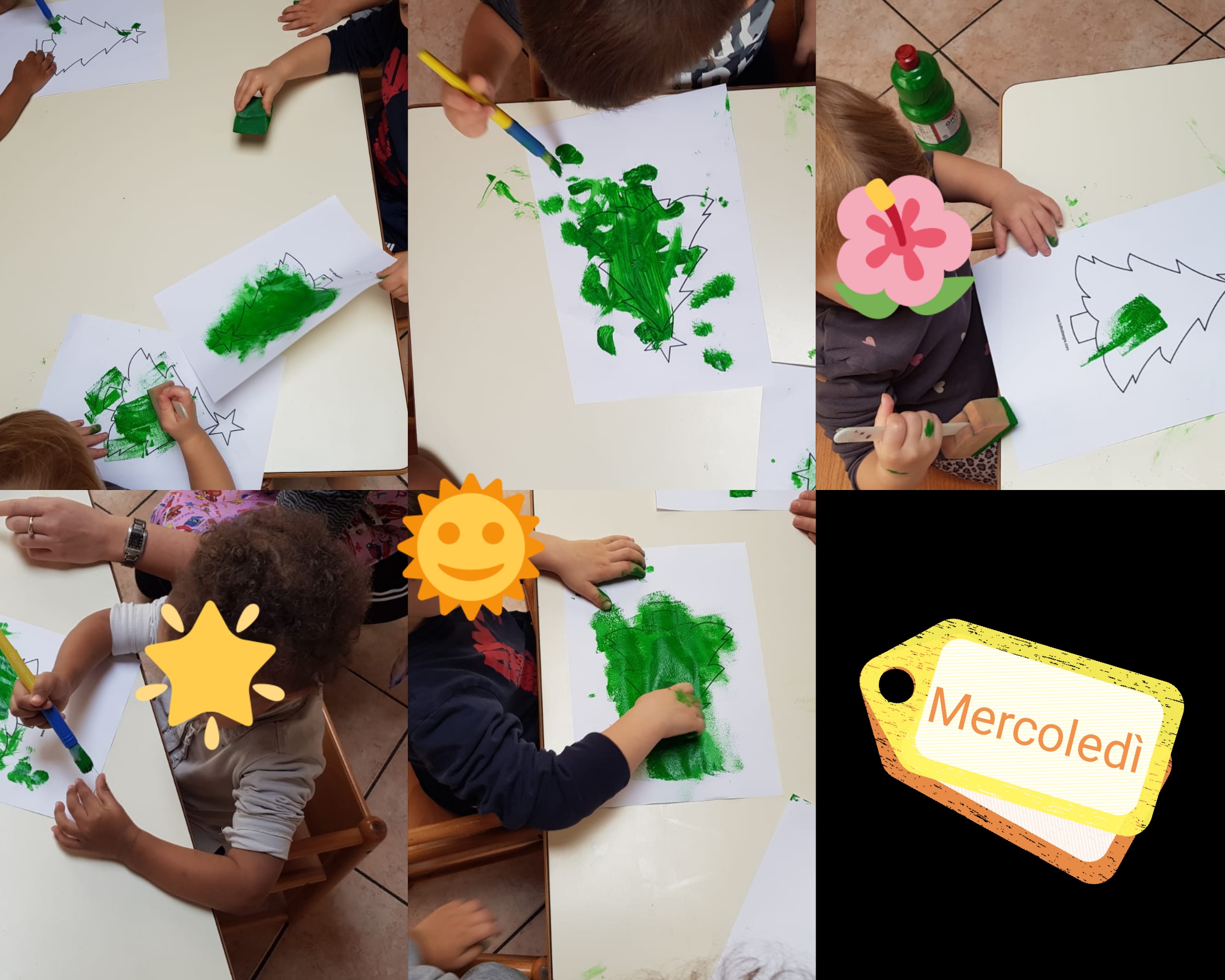 Tutti insieme ci dedichiamo all’attività espressiva: iniziamo a preparare le decorazioni natalizie e oggi in particolare con le tempere pitturiamo gli alberi di natale, che bello!