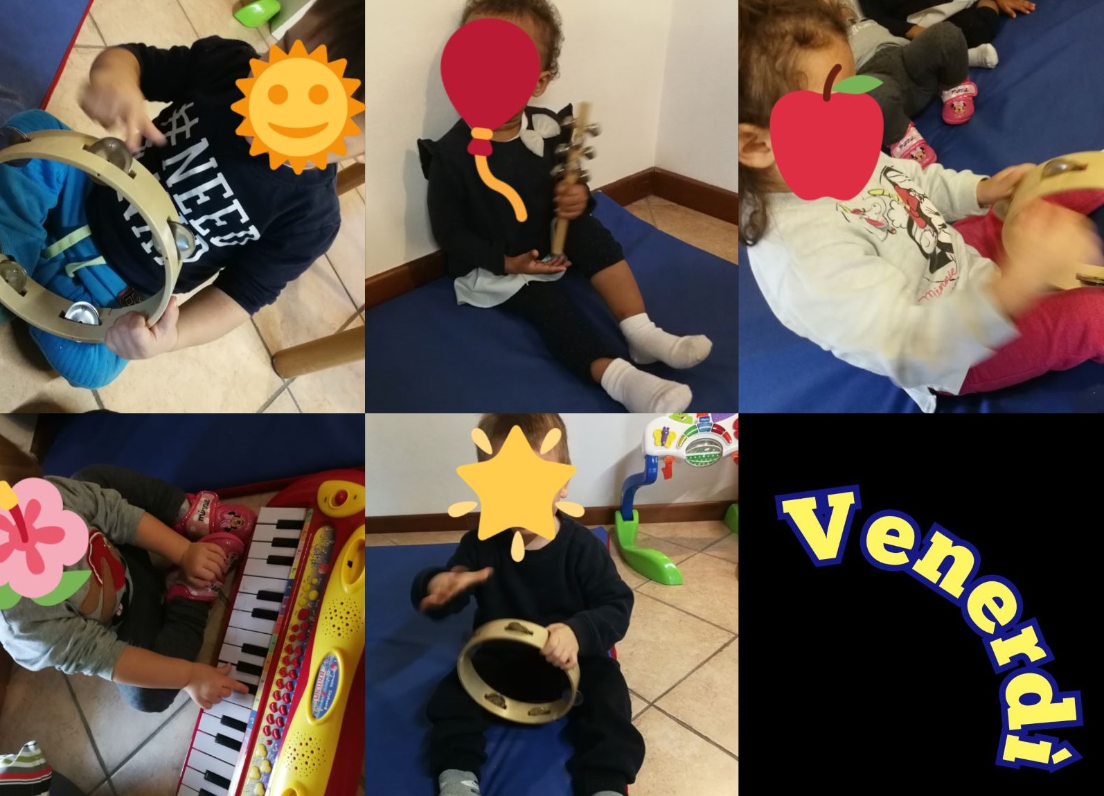 Tutti insieme facciamo l’attività musicale: distinguiamo i suoni lievi e forti, poi ci sperimentiamo tutti con il tamburello e con i diversi strumenti.